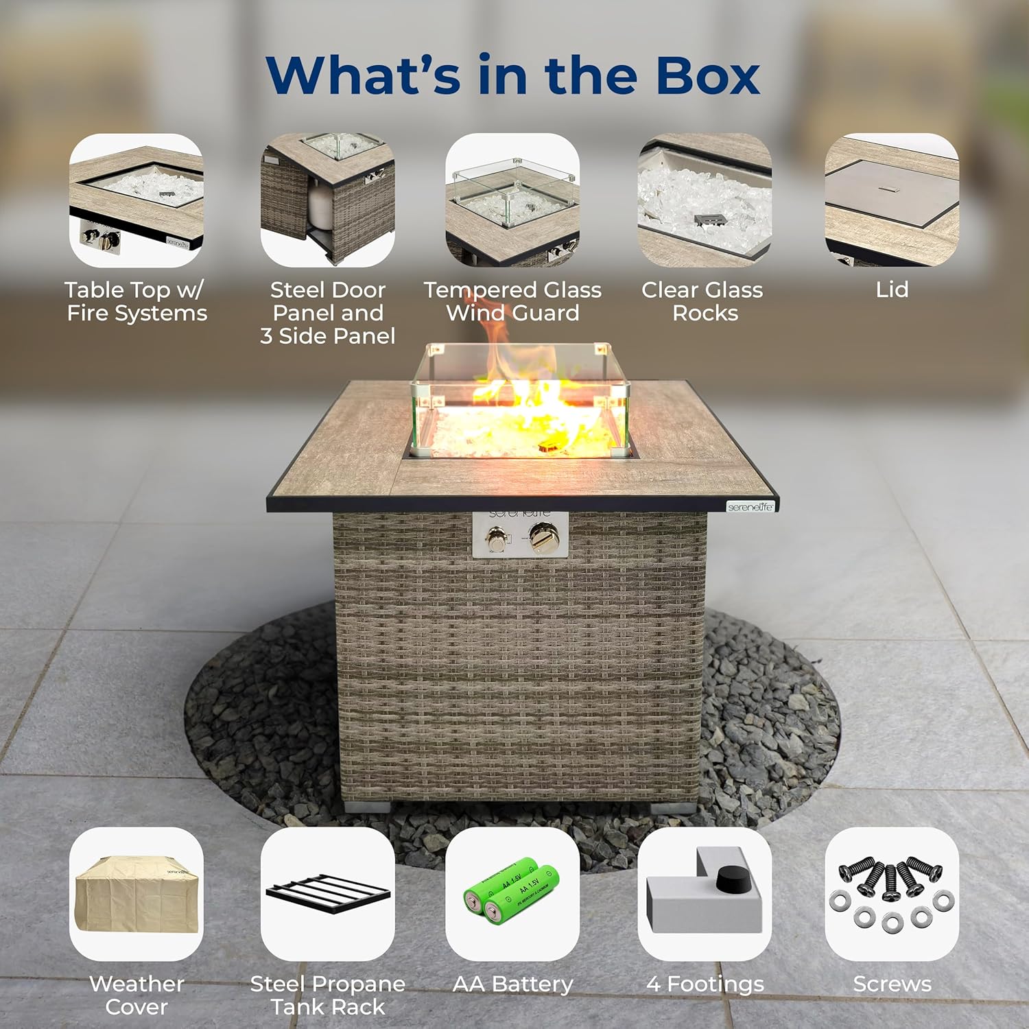 - FIRE PIT AND TABLE IN 1: This fire table not only provides heat to keep you warm during winter it also doubles as a table in summer. Creates an elegant atmosphere in the garden, terrace, balcony, or backyard. Comes w/ a box of clear glass rocks