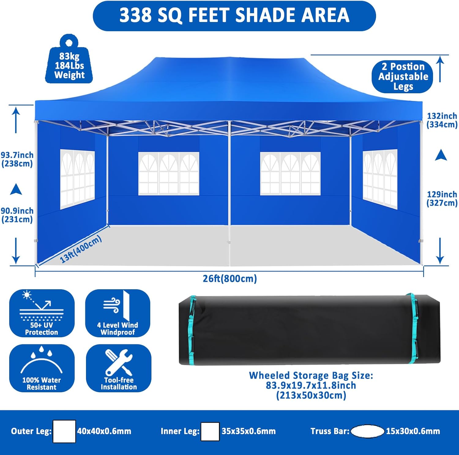 - 【2 Height Settings】13x26 pop up party tent straight leg has 2 height settings. Pull ring lock system easy to lock and release, raise the pop up tent to a desired height. Canopy tent 13x26 straight leg height options: 231cm/90.9inch, 238cm/93.7inch. Corresponding party tent center height options: 327cm/128.7inch,334cm/131.5inch. 13x26 canopy with sidewalls perfect for commercial activities, camping, festivals, tailgating, backyard events and etc..