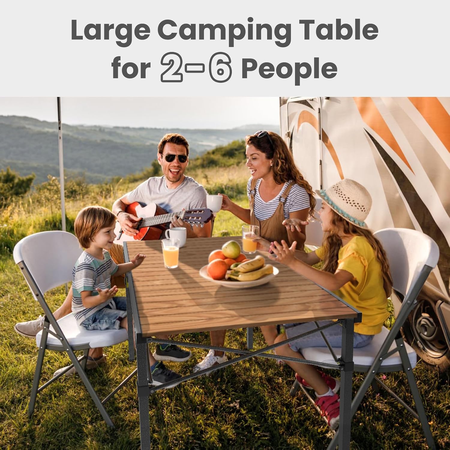 - Large Size: The foldable camping table features a spacious 46.4 × 27.5-inch tabletop, providing ample room for a small party of 4-6 people or a family gathering. With a 27.6-inch height, it comfortably accommodates chairs, allowing you to stretch your legs freely without hitting any obstructive bars underneath.