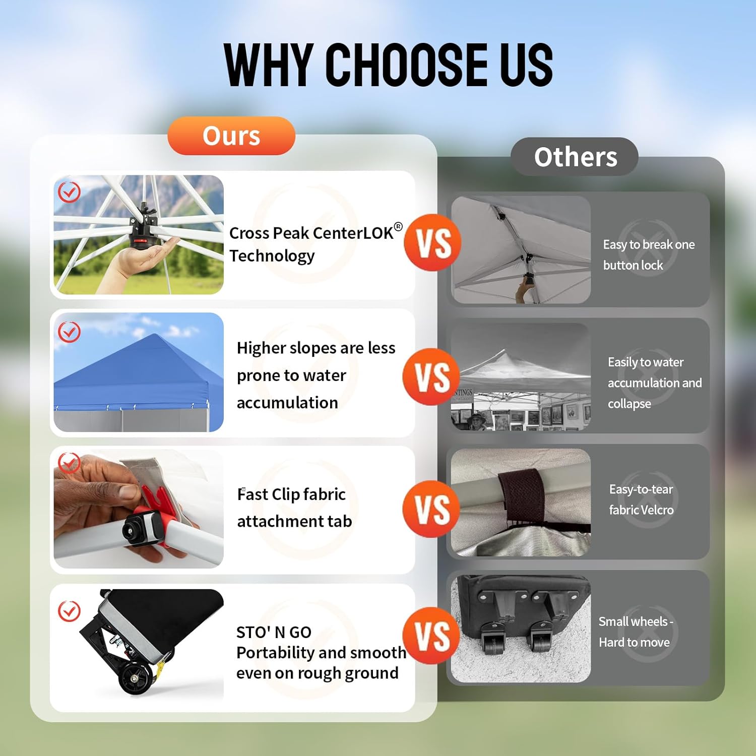 - UPGRADED WEATHER-RESISTANT FABRIC: Constructed with 400D fabric, the canopy offers superior protection against rain and UV rays with a UPF rating of 50+. The water-resistant material and Easy Clip system prevent water pooling.