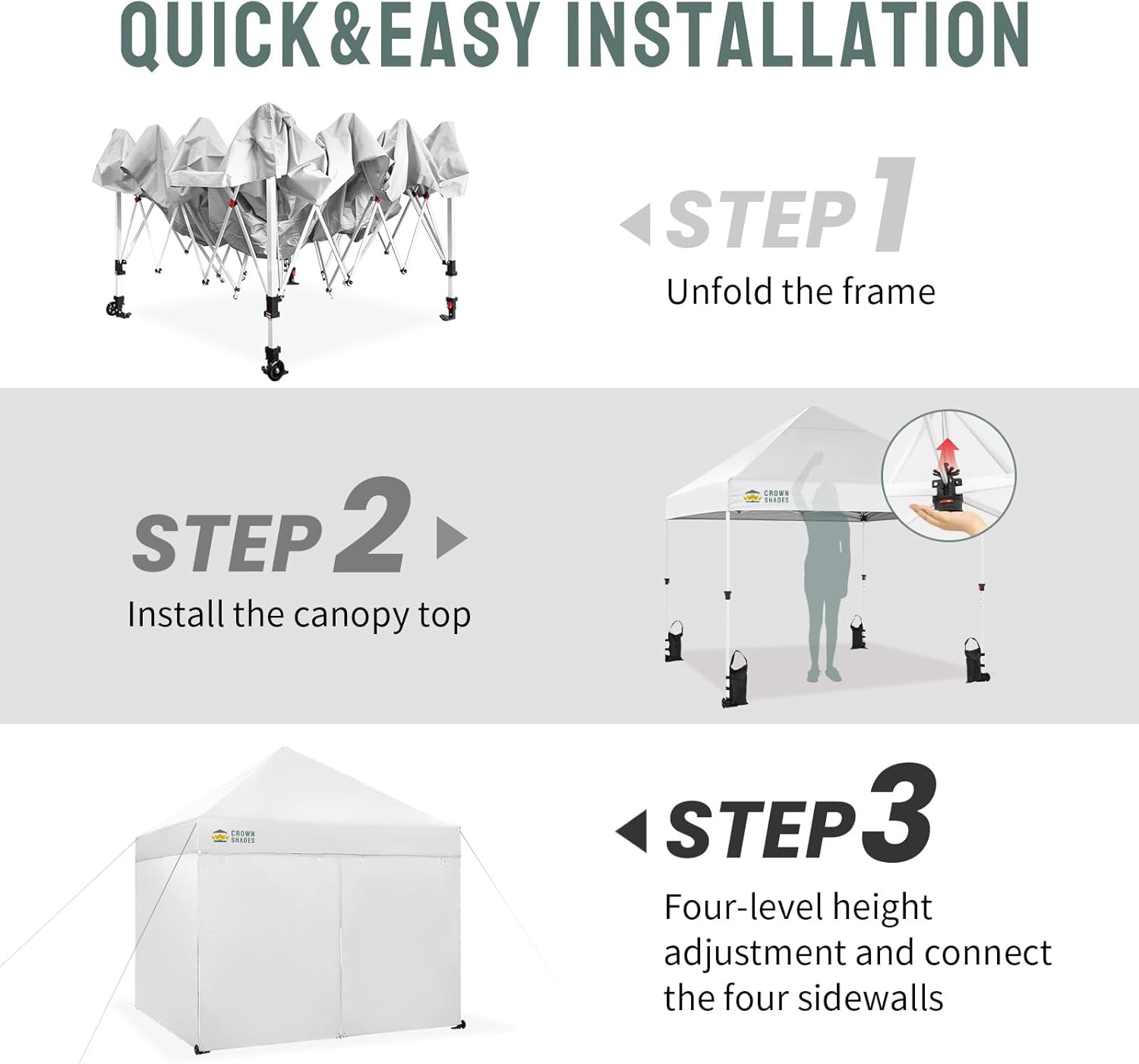 CROWN SHADES 10x10 Pop Up Canopy Tent Instant Commercial 1-Person Setup Patended Centerlock with 400D Fabric, 4 Sidewalls, 4" Wheels, 4 Upgraded Weights, Sto'N Go Bag, White