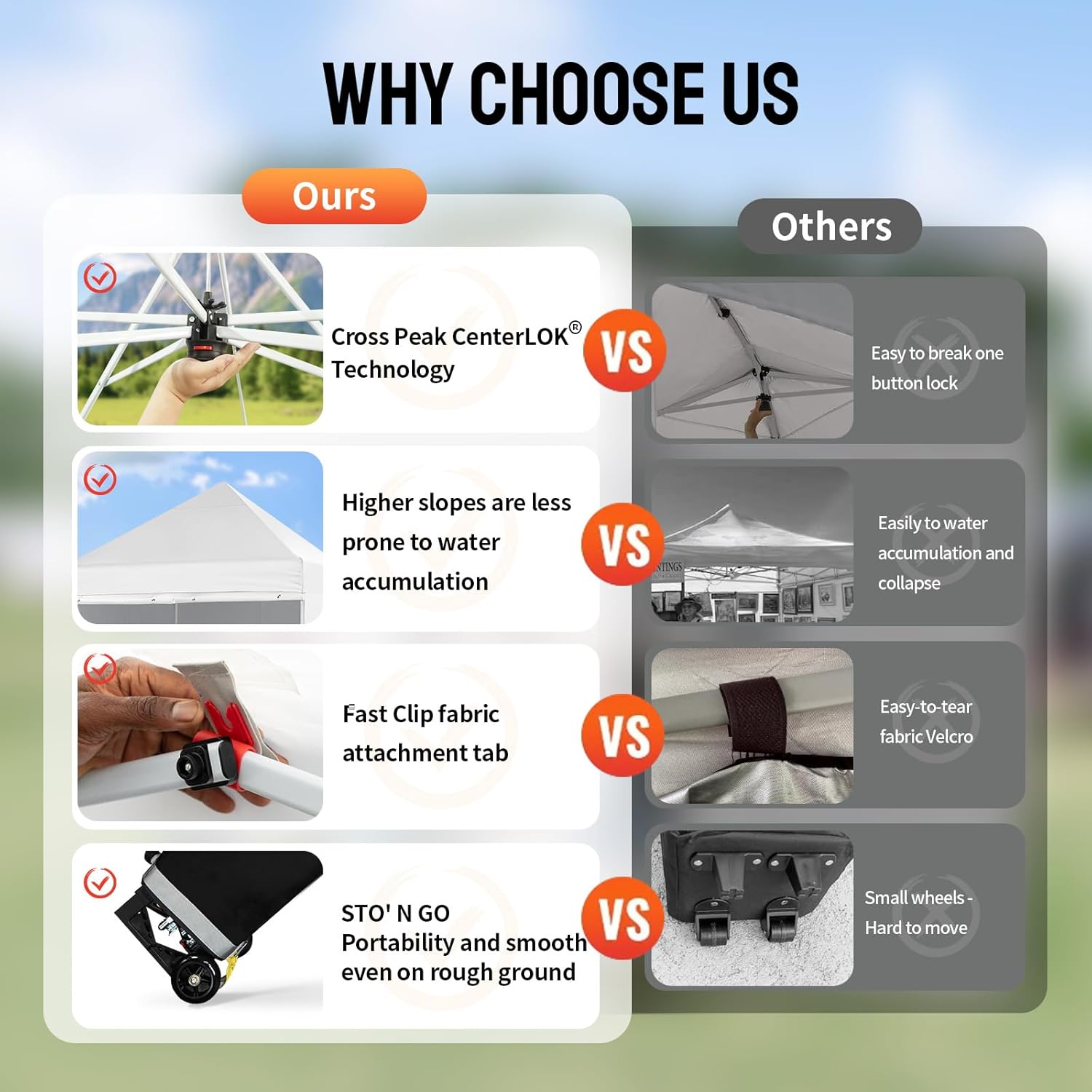 - ENHANCED STRENGTH & STABILITY: Enhanced with patented 8-way center lock technology and thickened leg poles. (11.8" diameter), this canopy provides over 10'8" of interior height, ensuring stability in various weather conditions, suitable for commercial and recreational events.