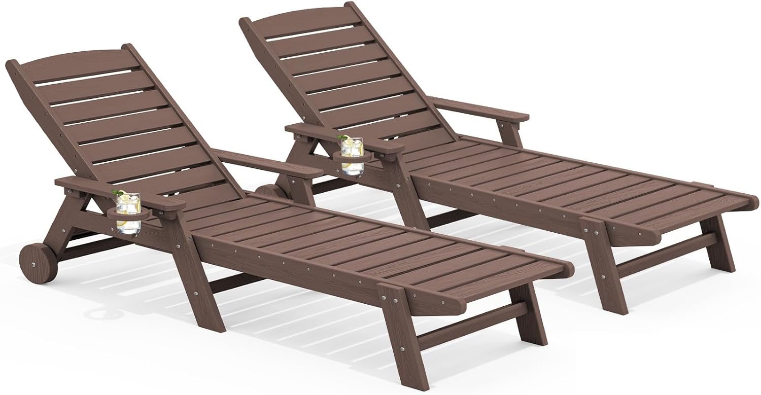 SERWALL Patio Chaise Lounge Chair Set of 2, 78'' Long 5-Positions Adjustable HDPE Outdoor Lounge Chair for Pool, Poly Lounge Chair with Rolling Wheels & Cup Holder for Poolside, Deck, Coffee Brown