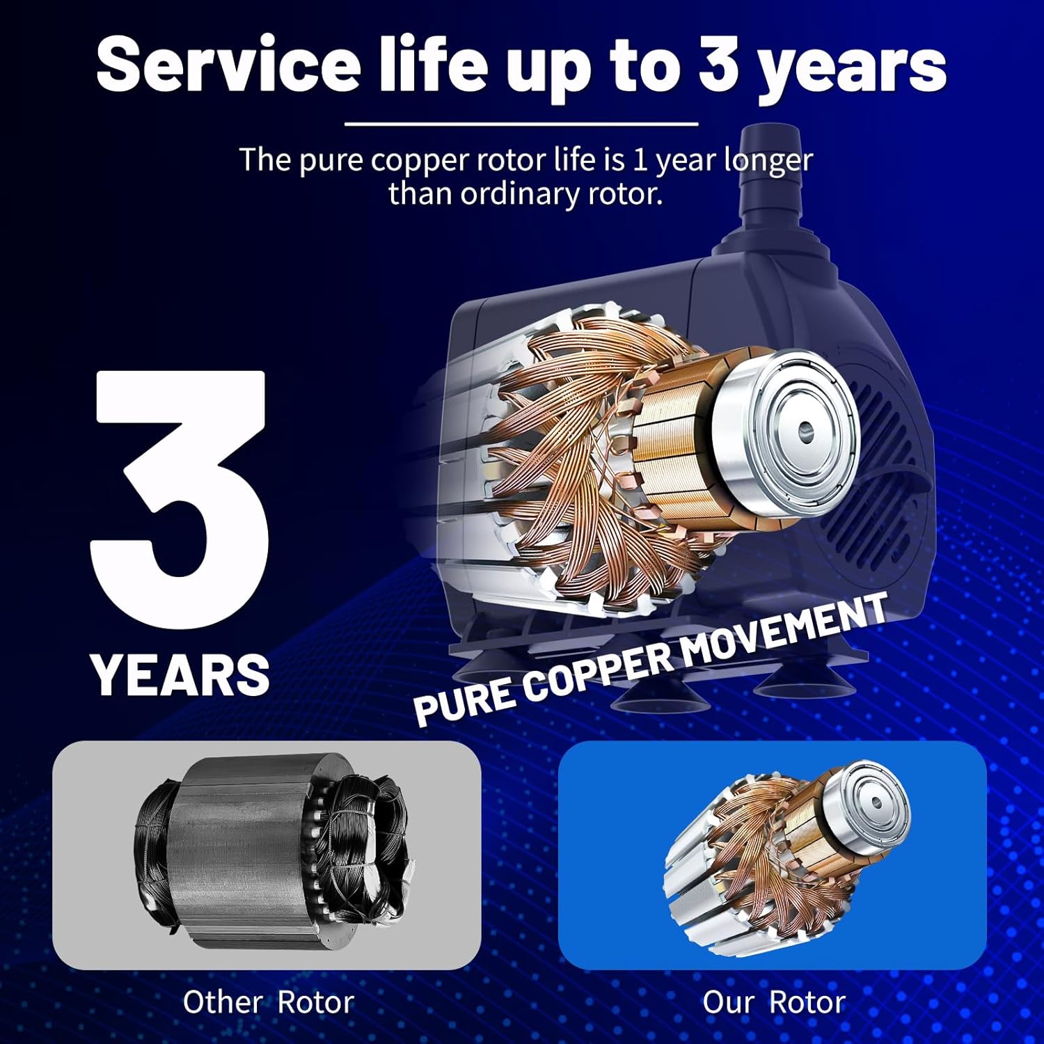 - 【AUTO-SHUT-OFF & SAFE】This pump is AUTO SHUT OFF designed,It's an upgrade of our old version.When your fountain or pond has low water level due to splashing and evaporation,the pump will automatically turn's off,and turn's back on once the water is added.Effectively prevent pump burns out and keep you and your family safe.