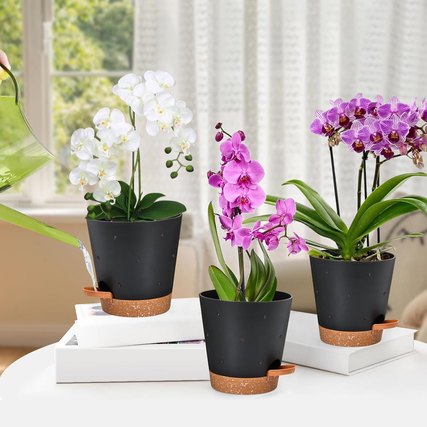 Orchid Pots with Holes, 6 Inch Self Watering Orchid Pot 2 Pack Plastic Plant Pots for Orchid, Flower (Black+Brown)