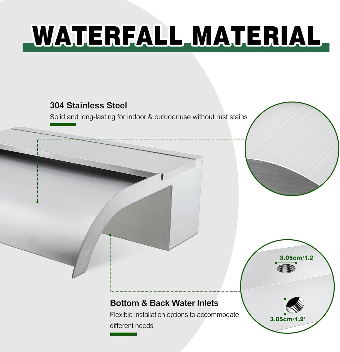 - 【Anti-Rust Spillway Waterfall】- Our welded in one body one-piece 304 stainless steel construction of this spillway waterfall provides long-lasting strength, rust resistance, and leakproof performance. The open lip design creates an elegant freefalling waterfall that adds decorative flair to ponds and pools. The soothing sound of the cascading water promotes relaxation and tranquility. LED light strips not included, but available separately.