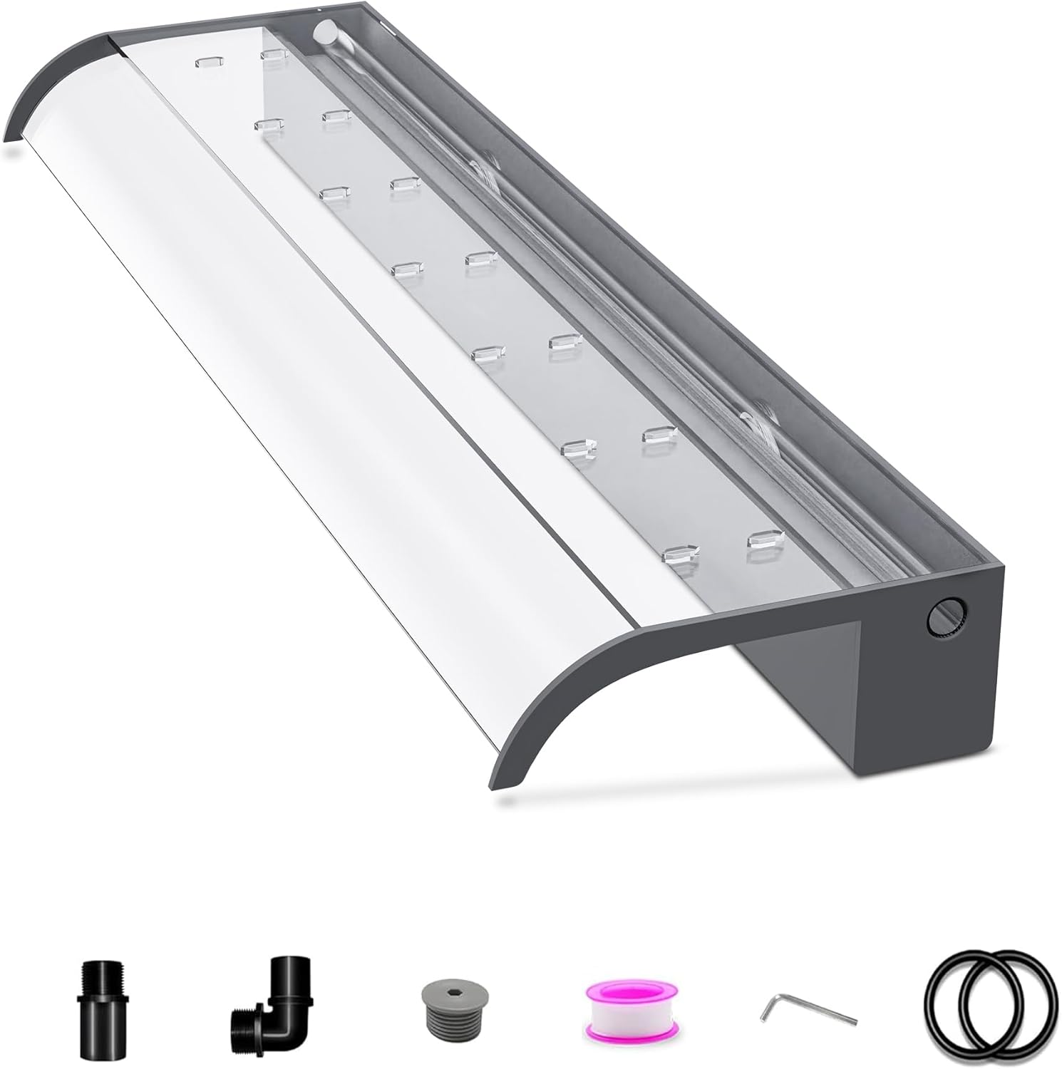 - 【Updated Curved Open Lip】- Unlike other narrow, short waterfalls, our updated pond waterfall features an integrated 8-inch wide water platform and 4-inch high water storage tank platform, and curved open lip. This wider, longer design creates a stable, smooth stunning water flow, so you can better enjoy the soothing sights and sounds of the cascading water. Waterfall does not include LED lights. Purchase them in our store.
