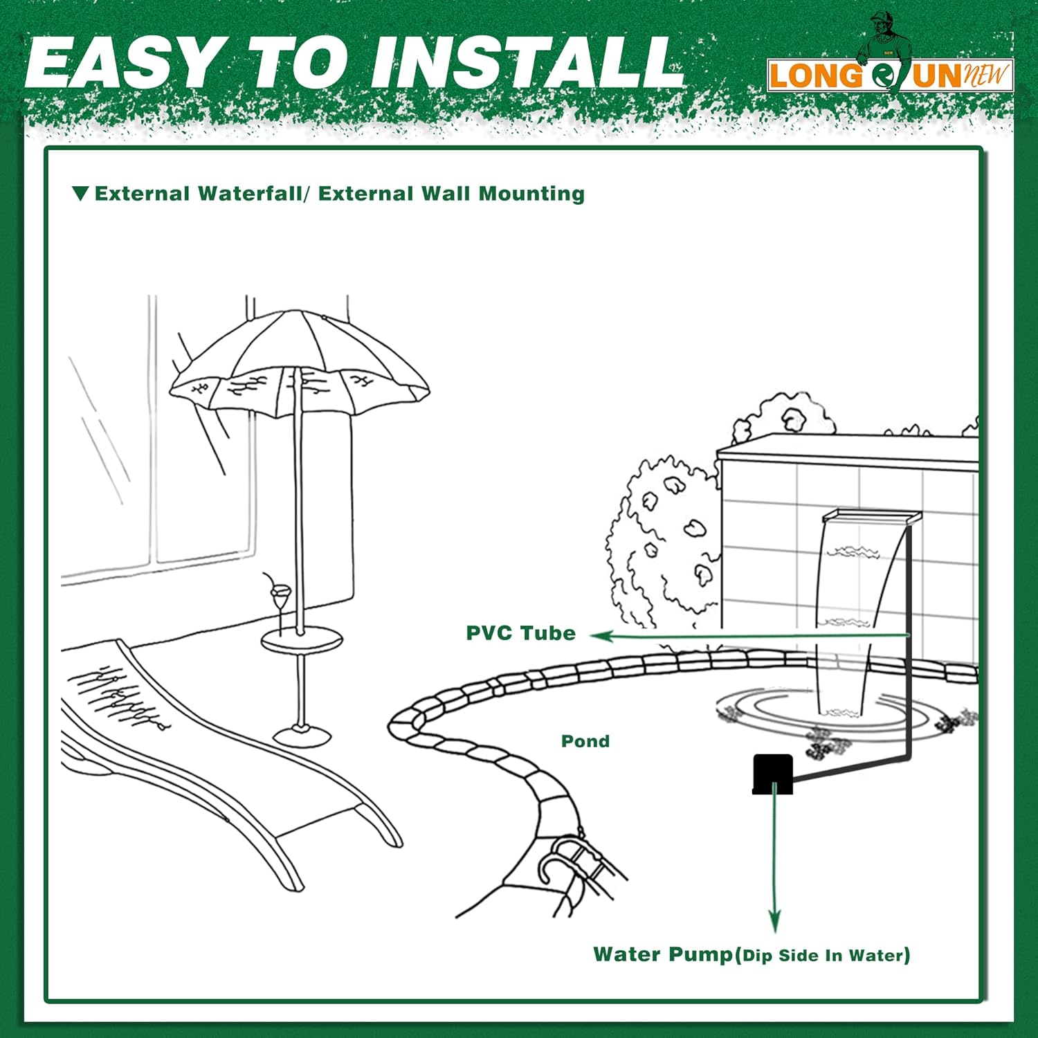 - 【Garden & Pond Decoration Waterfall】- The LONGRUNNEW waterfall spillway adds decorative elegance and beauty to gardens and pools. Optional color-changing LED light strips, sold separately, create a special ambience at night. The gentle sound of the cascading water enhances outdoor patios. Note: LED light strips are not included with the waterfall but can be purchased separately in our store.