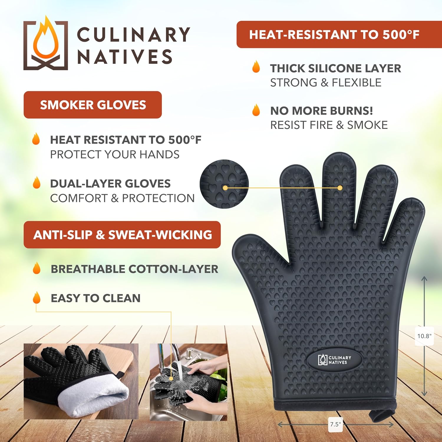- πͺ½ DUAL-LAYER BBQ GLOVES - With a robust design and soft dual-layer cotton, these meat smoking gloves can handle the heat! Maximum comfort & protection with a glove that is wider, thicker, and more protective than the other leading brands. Pick up, flip & turn hot meat on the grill! Avoid burns with ultra-grippy silicone grill gloves.