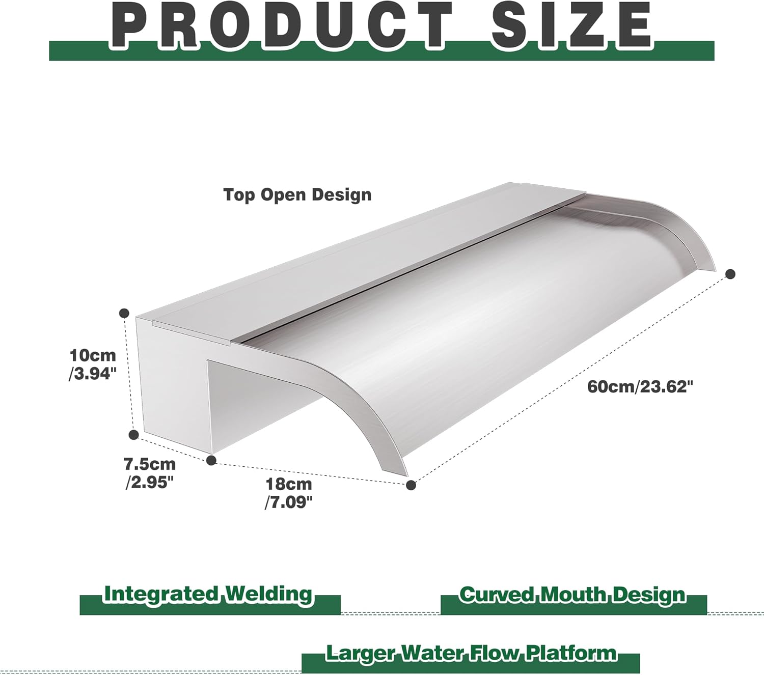 - 【Anti-Rust Spillway Waterfall】- Our welded in one body one-piece 304 stainless steel construction of this spillway waterfall provides long-lasting strength, rust resistance, and leakproof performance. The open lip design creates an elegant freefalling waterfall that adds decorative flair to ponds and pools. The soothing sound of the cascading water promotes relaxation and tranquility. LED light strips not included, but available separately.