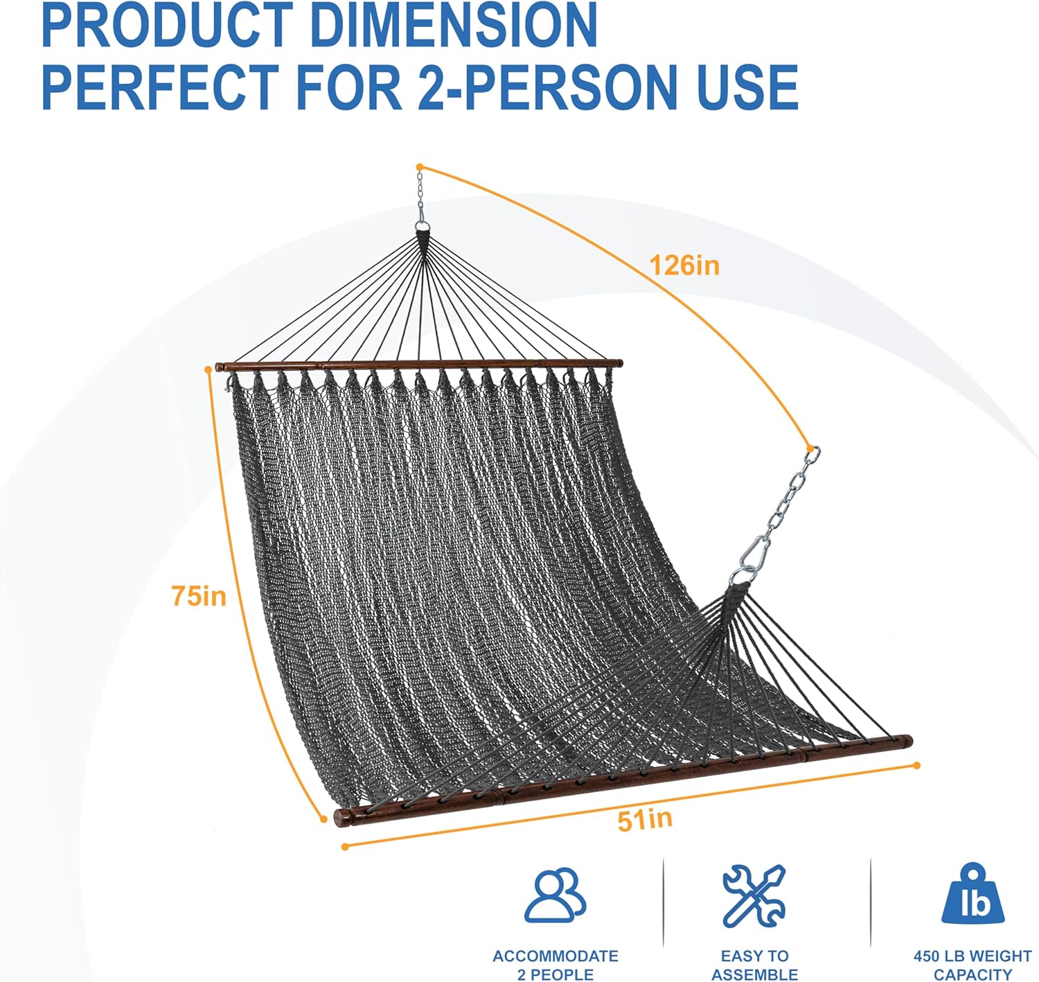 - Adapts to 12-13FT hammock stand: The hammock has an overall length of 126 inches and comes with two chains (each link is 7.4 inches long);Due to the way the hammock is woven, it stretches when in use,so 12-13FT hammock stand is required