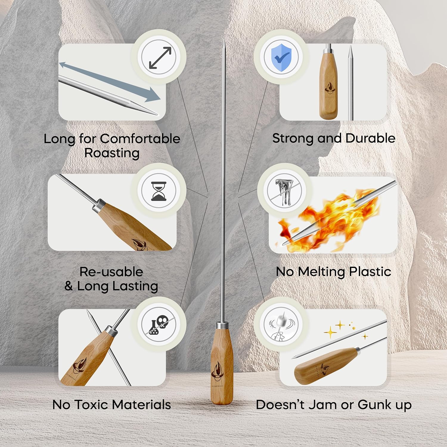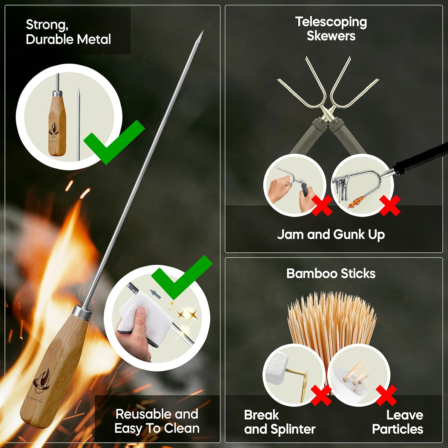 - π THICK DURABLE STAINLESS STEEL: These smores sticks can handle heavy-duty roasting without any worry of corrosion or wear. Also, unlike telescoping skewers, they have no moving parts. This prevents breakage and accumulation of debris and ensures an easy, effective roasting session.
