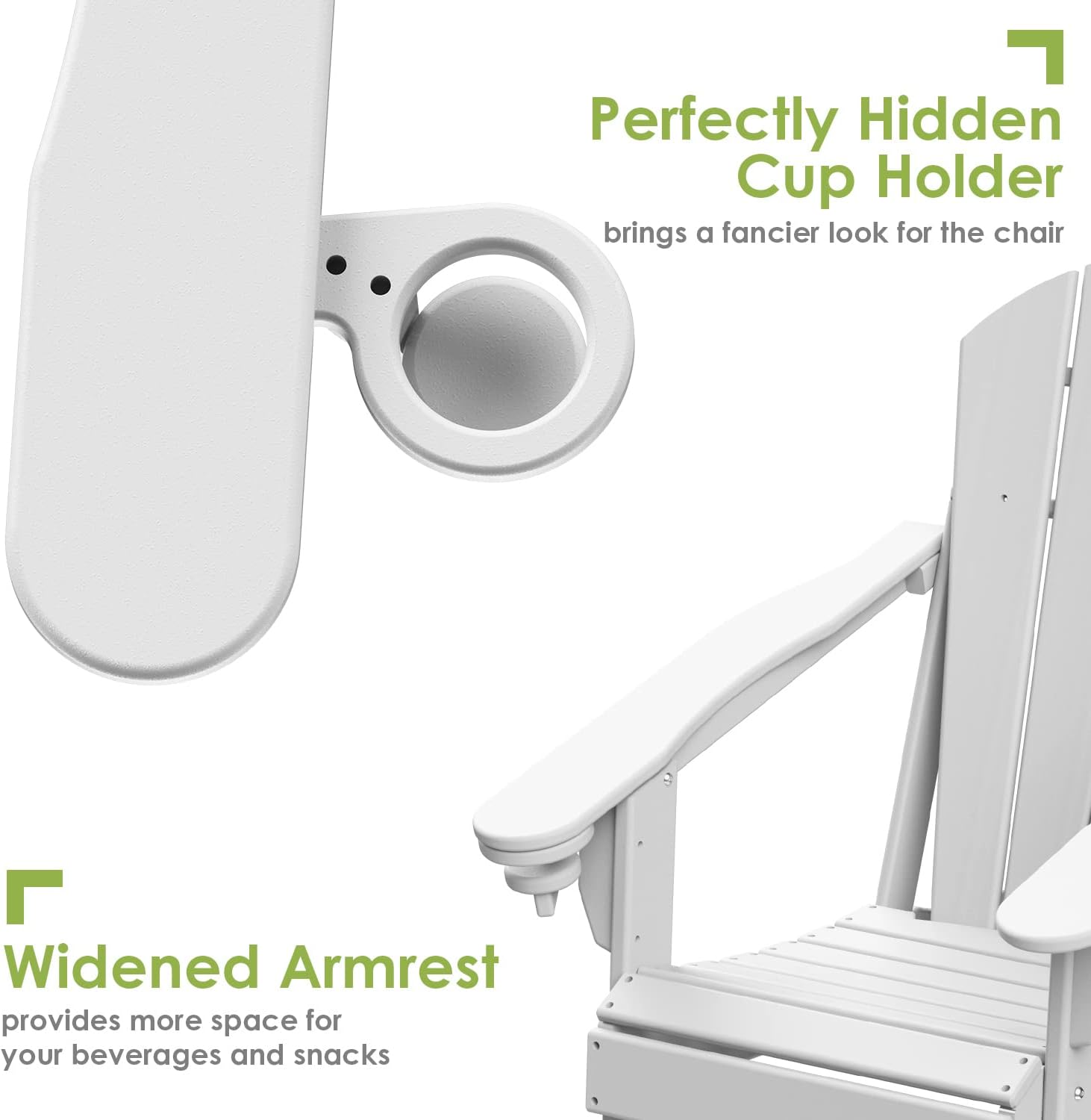- 【Ergonomic & Foldable】 GreenVines Folding Adirondack chair features a hidden cup holder in the right arm, offering ample space for drinks or media devices. The reclined legs are designed for stability without the need for pins or chains. Easily foldable, this chair is perfect for storage at home or for taking on road trips. The slatted seating ensures quick drying after rain, while trimmed edges enhance safety for you and your family