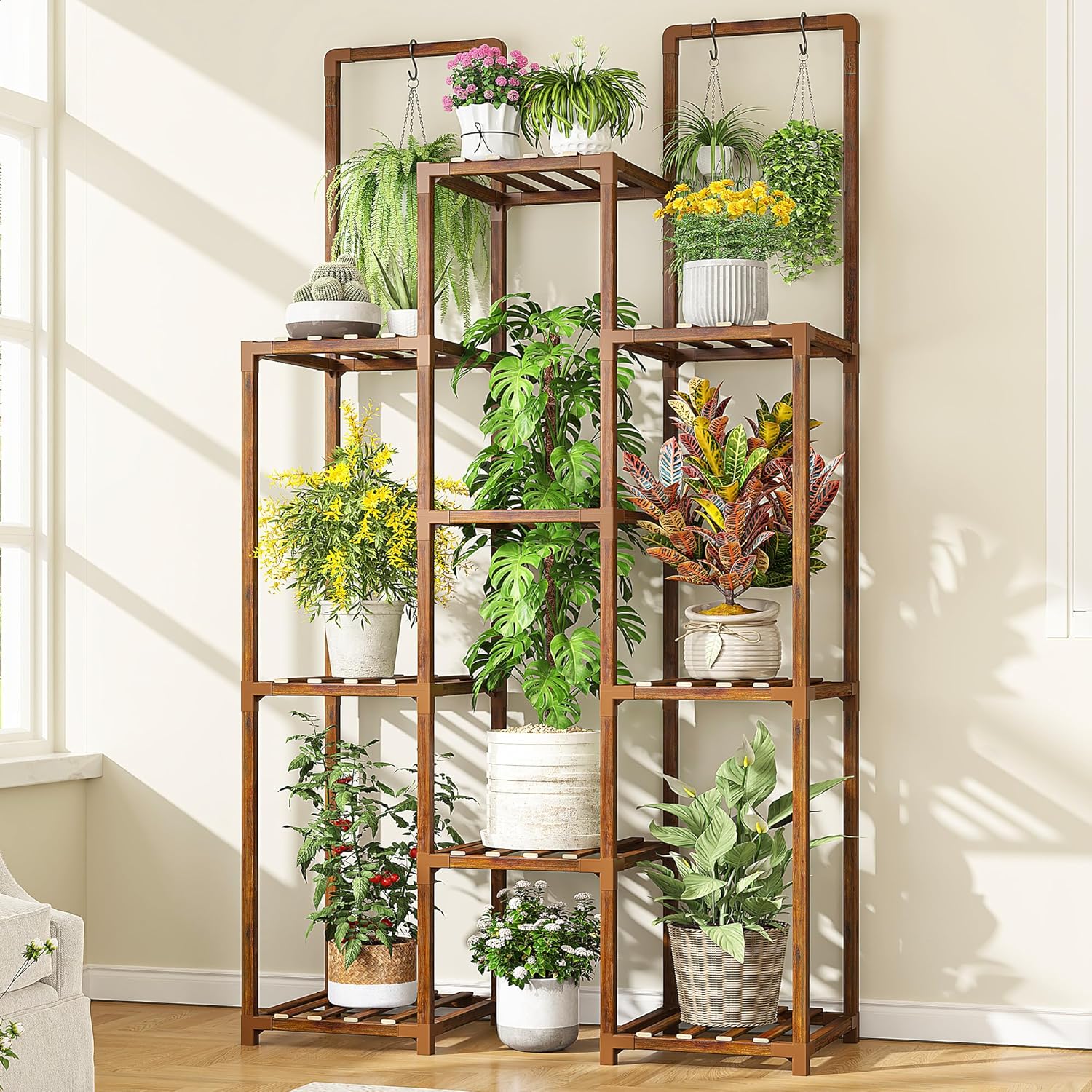- 【Large Capacity Plant Stand for 11-16 Pots and Space Saving Genius】Carefully designed wider shelves effortlessly hold more than 11 pots, providing a more spacious growing area for your tall plants, short plants, small pots or hanging plants etc, making each plant can stand in sunshine, absorb the balanced nutrients and sunlight in a comfortable environment. Open-frame design promotes air circulation and sunlight exposure, boosting plant health while adding chic decor. Maximize your greenery’s potential—revive your oasis now