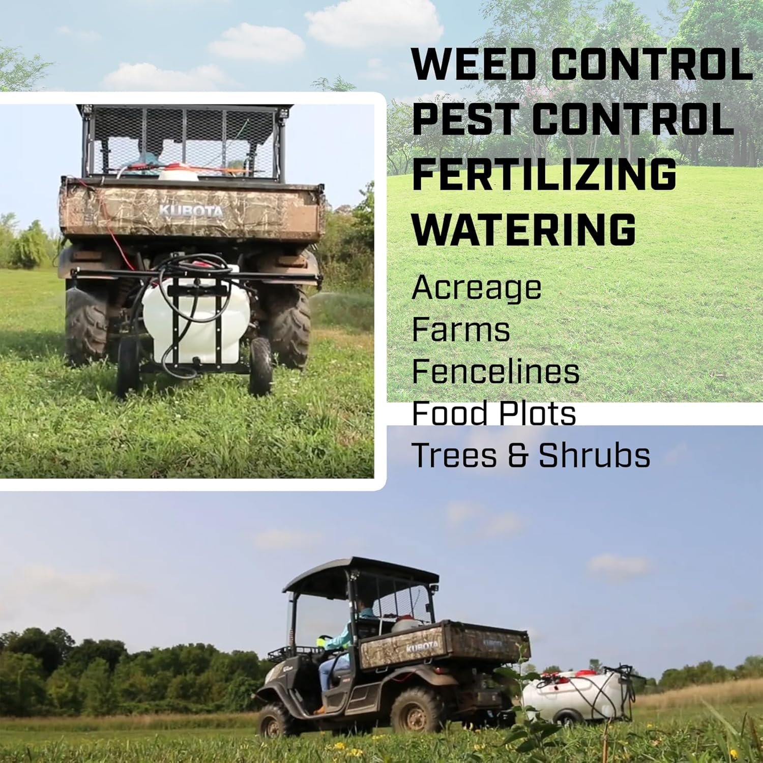 - BOOM INCLUDED: 2-nozzle spray boom (#6428) with a 7-feet spray pattern and adjustable height so you’re hot getting stuck in tall grass or scraping on uneven ground