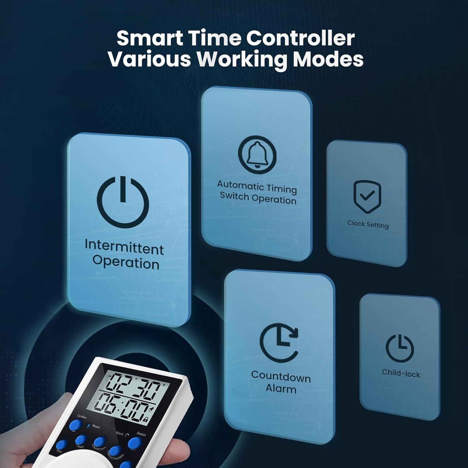 - Multiple Working Modes — Various timing functions could be set for energy efficient via the smart time controller such as automatic timing switch operation, countdown timer alarm, intermittent duty for the pond air pump aerator outdoor. The pond air pump could keep working without using the timer controller by manually turning on the switch after power on