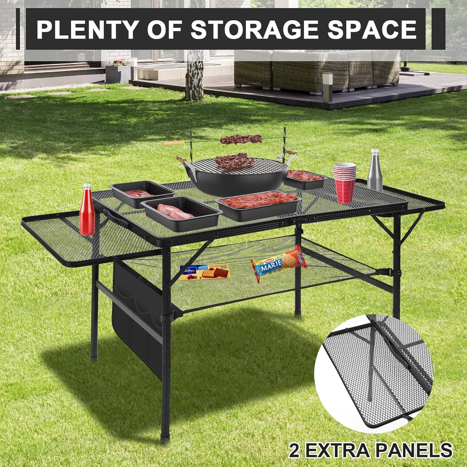 Folding Grill 4.4 FT Portable Camping Table with 2 Wing Panels, Height Adjustable Metal Outdoor Table with Mesh Desktop and Mesh Bag, Picnic, Beach and BBQ, Party, Black