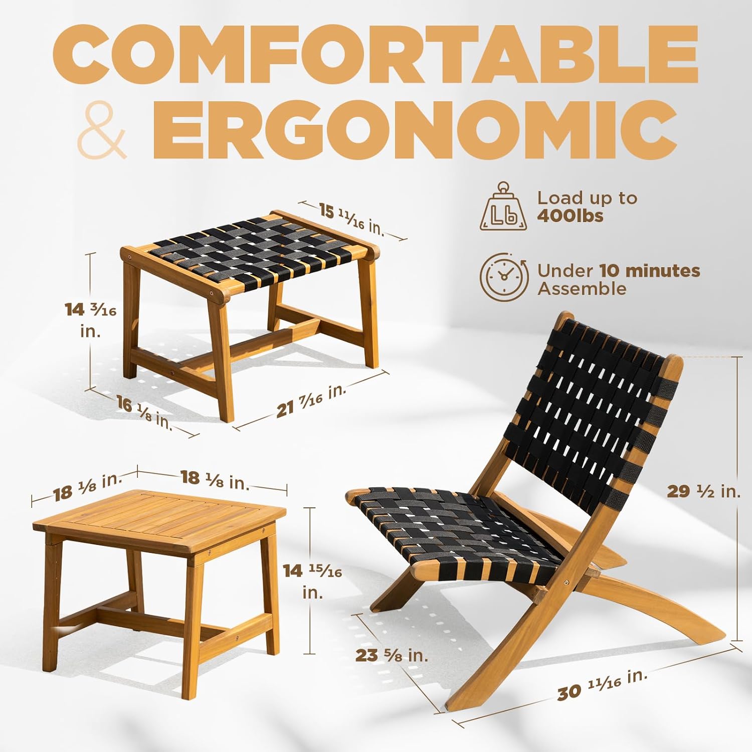• 『Durable Folding Bistro Set』: Built to withstand the elements, our 3-piece outdoor bistro set boasts a sturdy wooden frame supporting up to 400lbs for chairs and 150lbs for the table. Its foldable design ensures easy storage, making it ideal for any outdoor event or compact spaces.