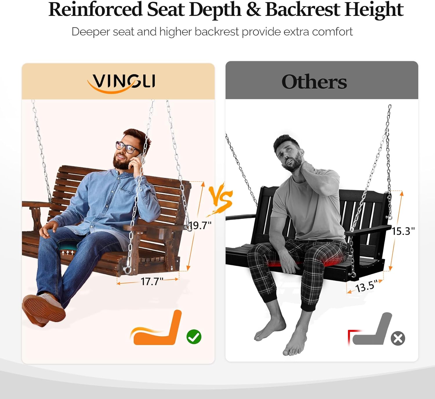- Upgraded Product Size - We add the seat depth and backrest height on our swing bench, only to better support your body and bring more relaxation. Seat Depth = 21.7β and Backrest Height = 19.7β