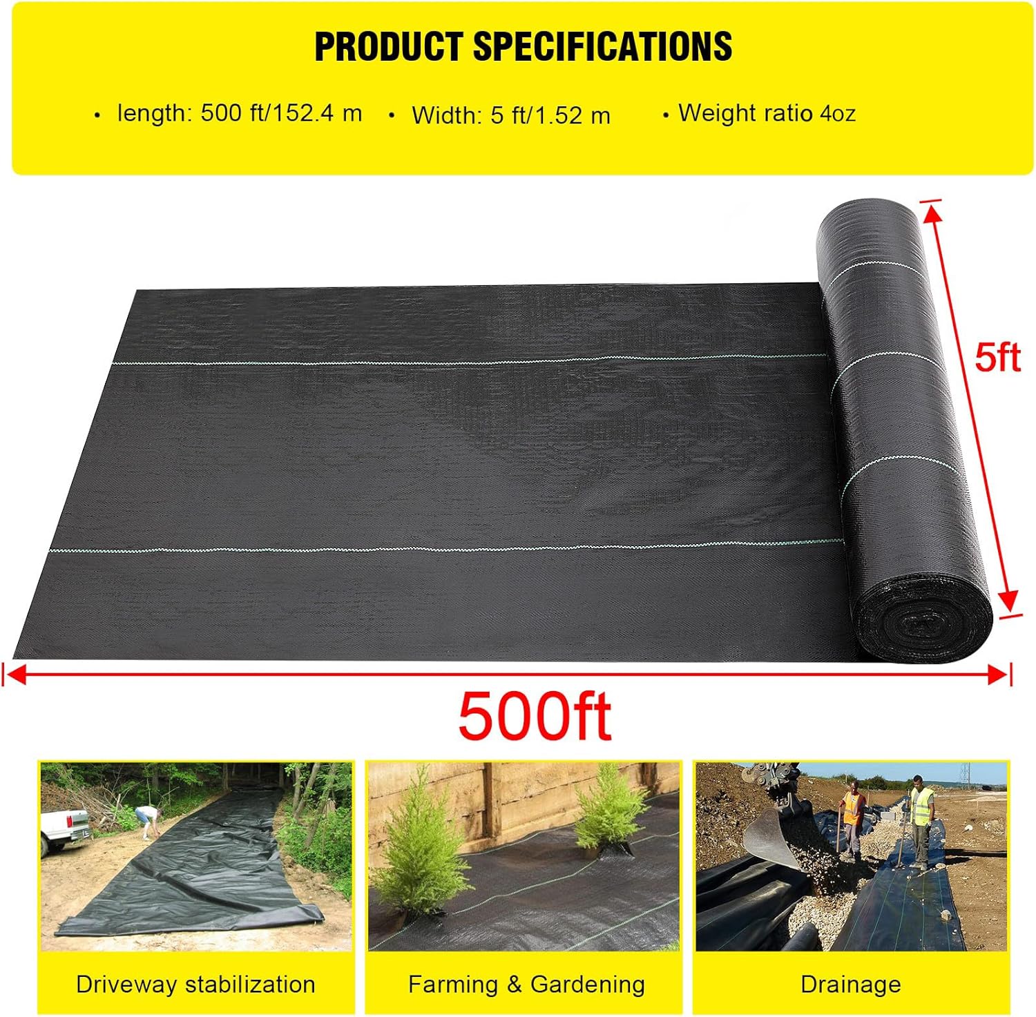 - 【Large Geotextile Fabric】- Our commercial-grade driveway fabric is Length: 500FT,Wide:5FT, 4oz.,High-quality fabrics have significant advantages,such as high elasticity and durability.