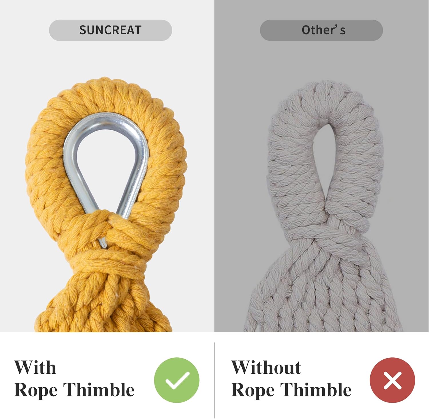 - Handcrafted Ropes: The metal rope thimble is effective for preventing the long-term friction between the tree strap and the ropes, thus prolong the service life of the hammock. The 18 ropes at both ends of the hammock are made of poly-cotton, tightly braided and fixed, which greatly increase the load bearing capacity