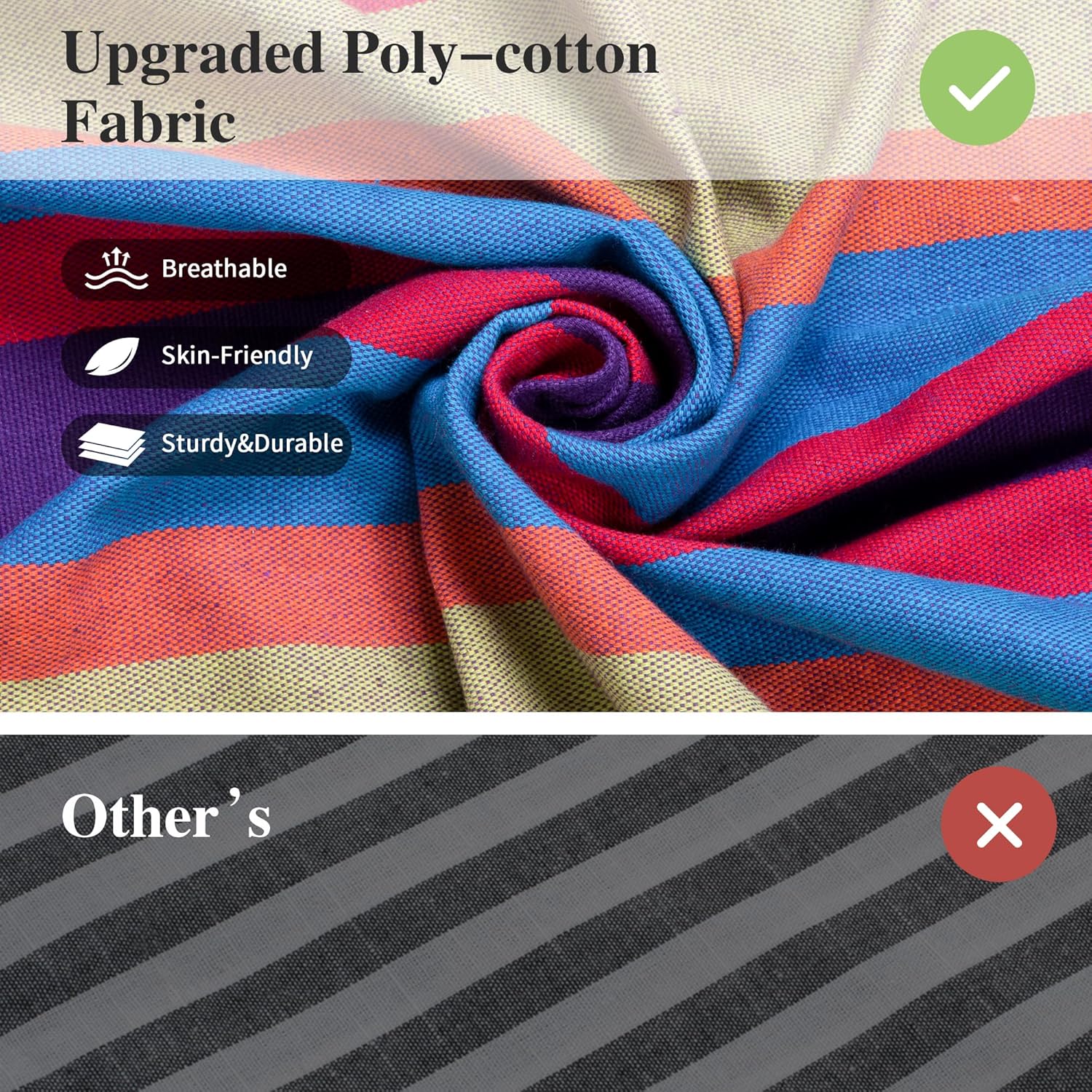 - Upgraded Fabric: Our Brazilian Camping hammock is made of eco-friendly thicker version poly-cotton fabric (no lint, no odor, not pilling, not fading, skin-friendly, and breathable), stronger and much more durable than ordinary fabric hammocks. A comfortable cocoon style hammock can keep you safe while enjoying the peaceful leisure time