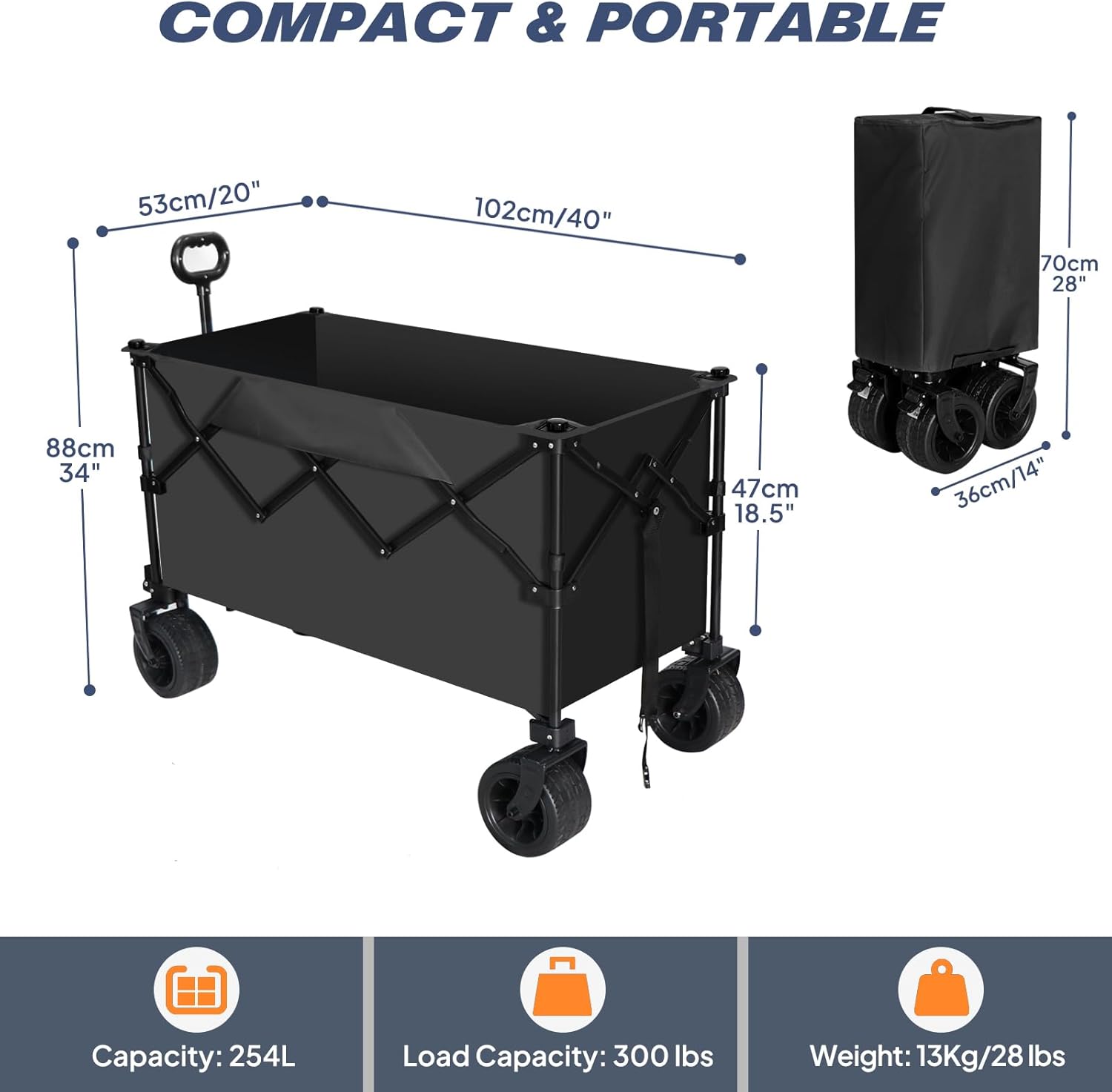 - High Capacity and Durability:Ample Storage Space.With a generous 254-liter capacity, the cart can hold a wide variety of camping gear, including tents, sleeping bags, cooking equipment, and more, reducing the number of trips needed to transport your belongings.Durable 600D Oxford Fabric.The ultra-durable material ensures that the cart can withstand the rigors of outdoor use, protecting your gear from the elements and rough handling.