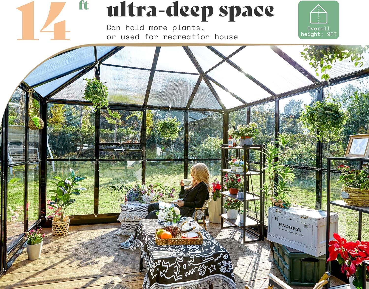 - 14x9.5FT Hobby Greenhouse & Sunroom: Anti-rust aluminum frame (1.5mm) Overall height: 9 FT, extra large space accommodating more plants, or used for recreation house, without the feeling of being cramped. Upgraded 6 FT wall height, easy to access, and no need to bend over