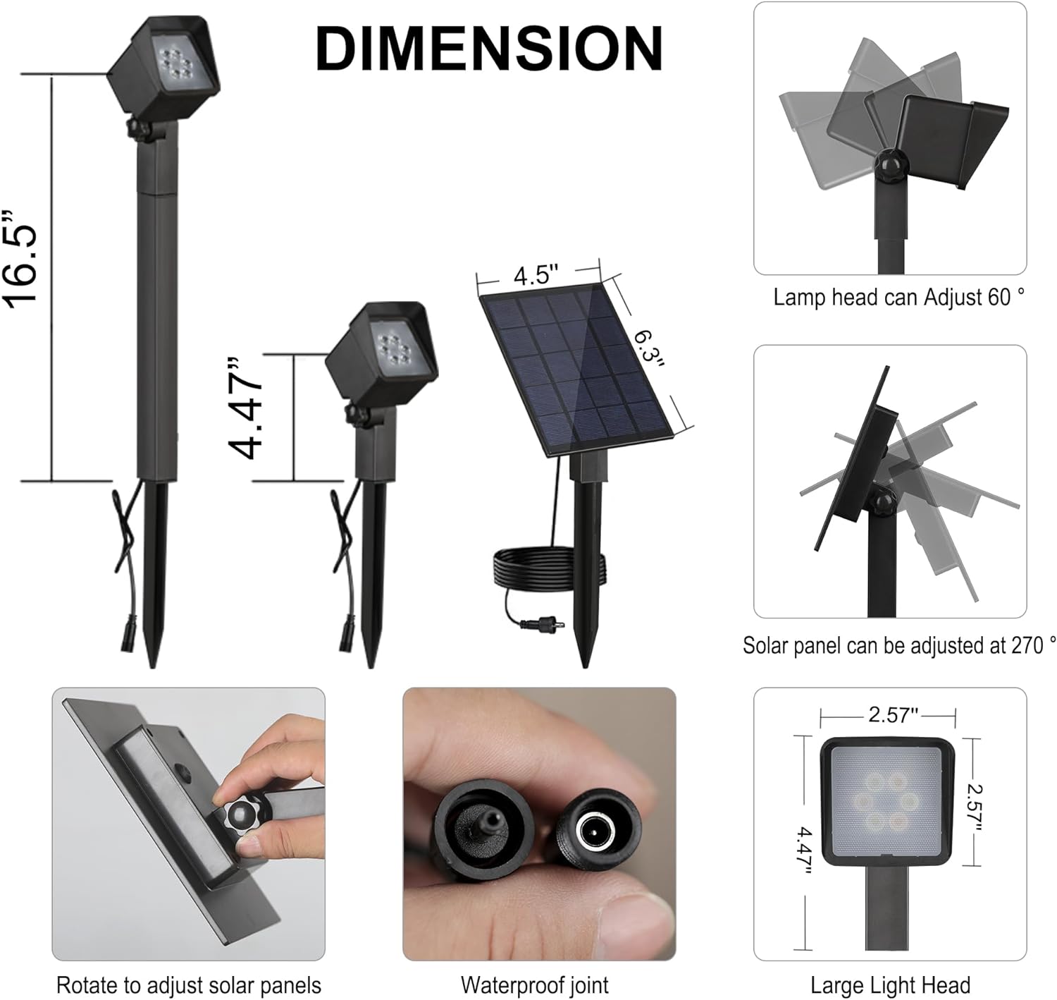 - ➽ EASY TO INSTALL AND USE - Solar powered and auto on/off…nothing could be easier! Simply use the included stakes to stick in the ground and turn on. The lights will last up to 10 hours at night in 50% power mode. The spotlight heads are adjustable to light up a tree or point down to light up a pathway.