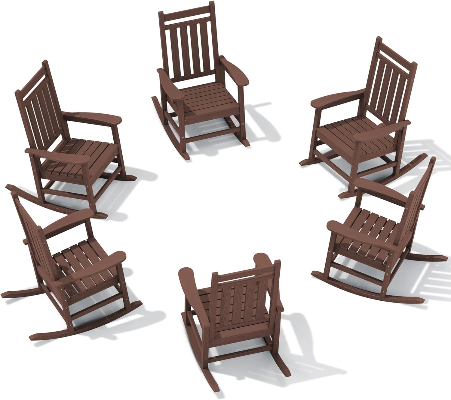 SERWALL HDPE Outdoor Rocking Chair Set of 6, Patio Rocking Chairs for Adults, All Weather Outdoor Rockers for Lawn, Brown