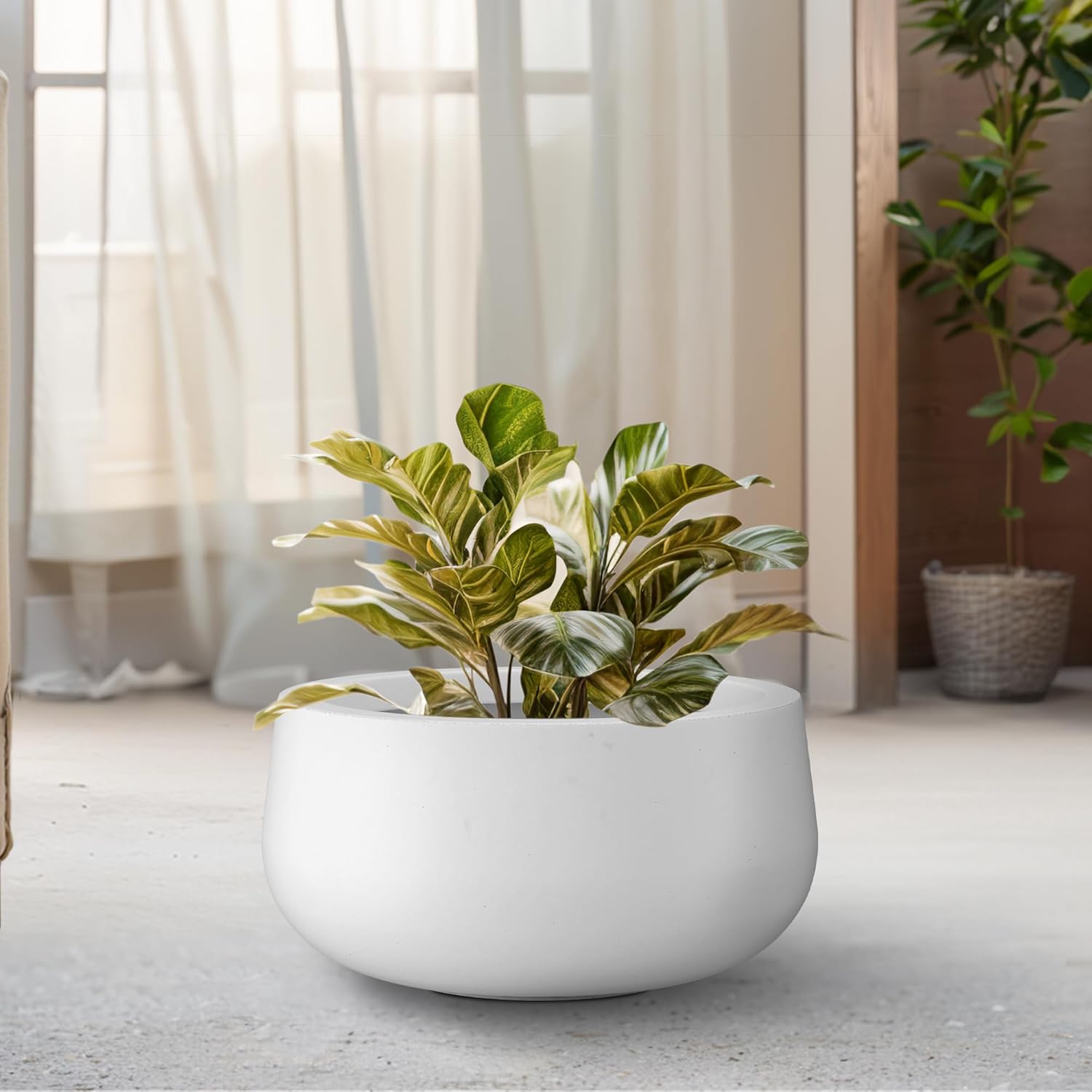 Kante 11.8" Dia Round Concrete Planter, Cement Plant Pots with Drainage Hole and Rubber Plug for Outdoor Indoor Garden Home, Modern Curvaceous Design, Pure White