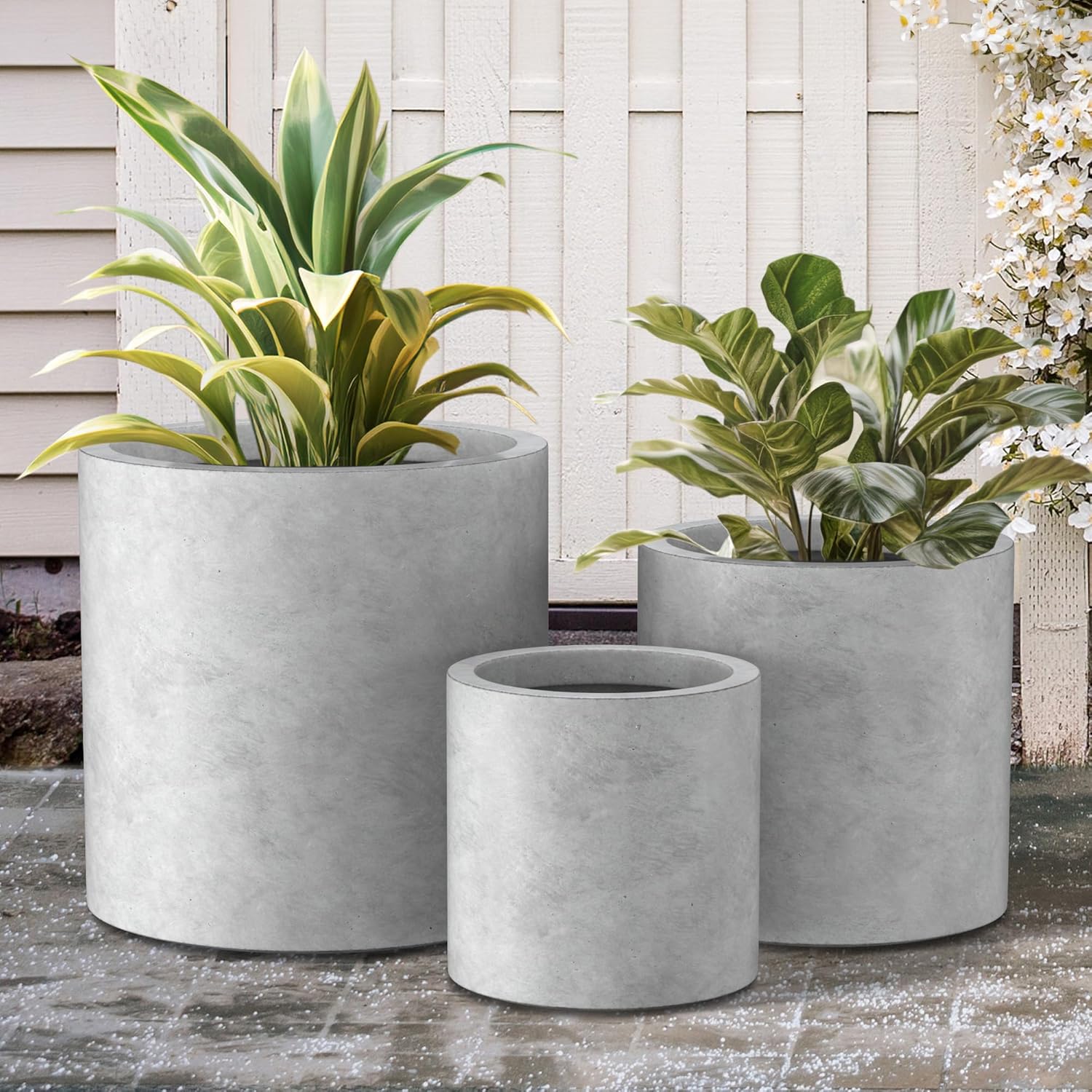 Kante 9.8",12.6",15.7" Dia Round Concrete Planter Set of 3, Modern Style Large Cylindrical Plant Pot with Drainage Hole and Rubber Plug for Indoor Outdoor Patio, Natural Concrete