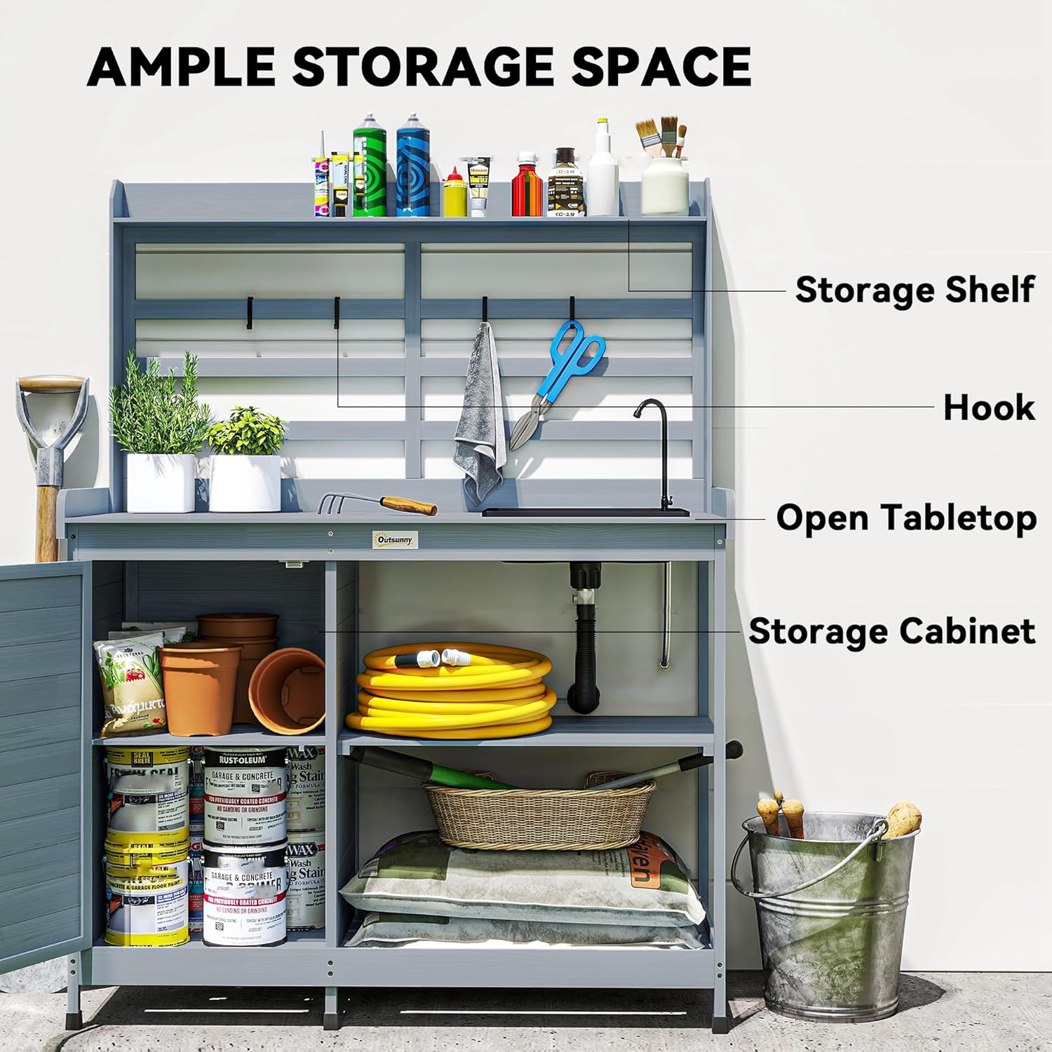 Outsunny Outdoor Wooden Potting Bench Table with Sink and Water Tap, Garden Workstation with Storage Cabinet, Storage Shelves for Backyard, Patio, Balcony, Gray