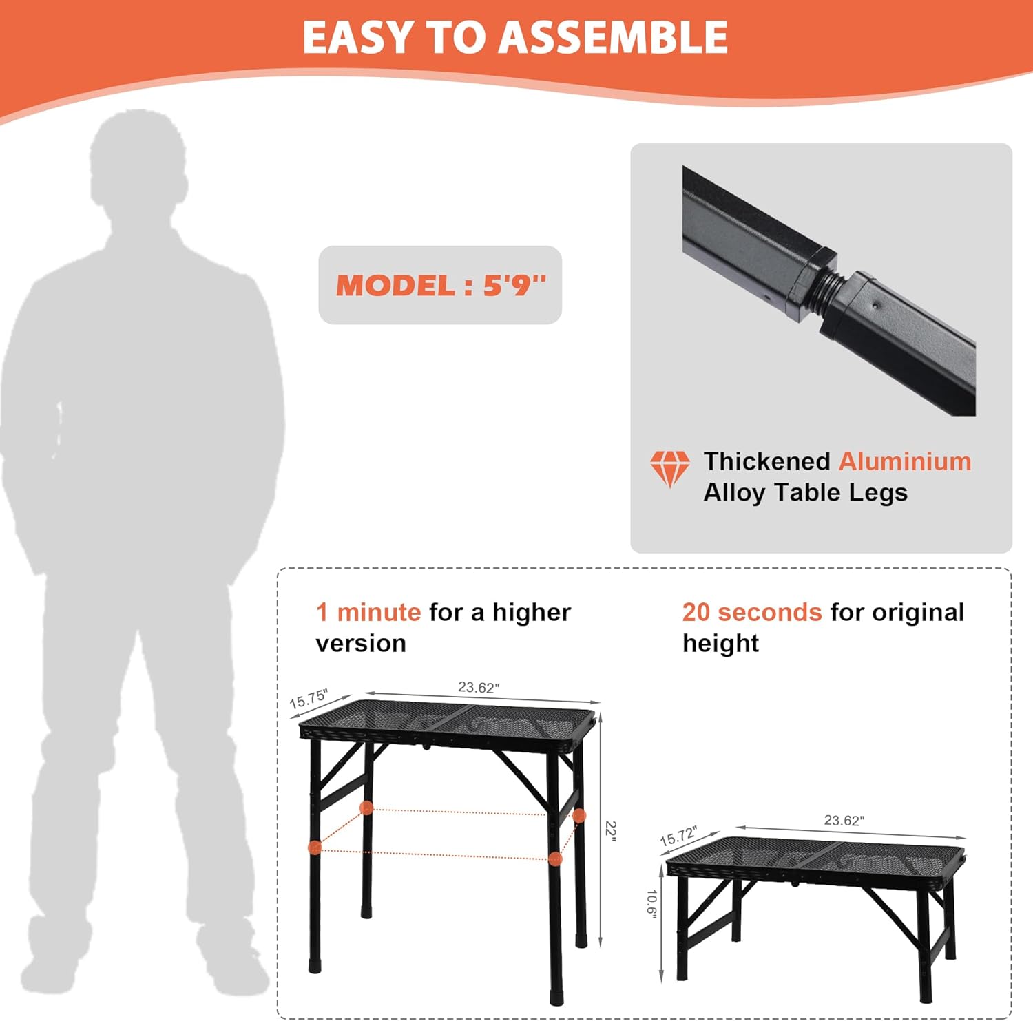 - Sturdy Metal Construction: The camping table is made of iron mesh desktop and aluminum alloy frame. Hexagonal thickened aluminium alloy tube table legs have a larger weight bearing area. Holds up to 90 lbs.
