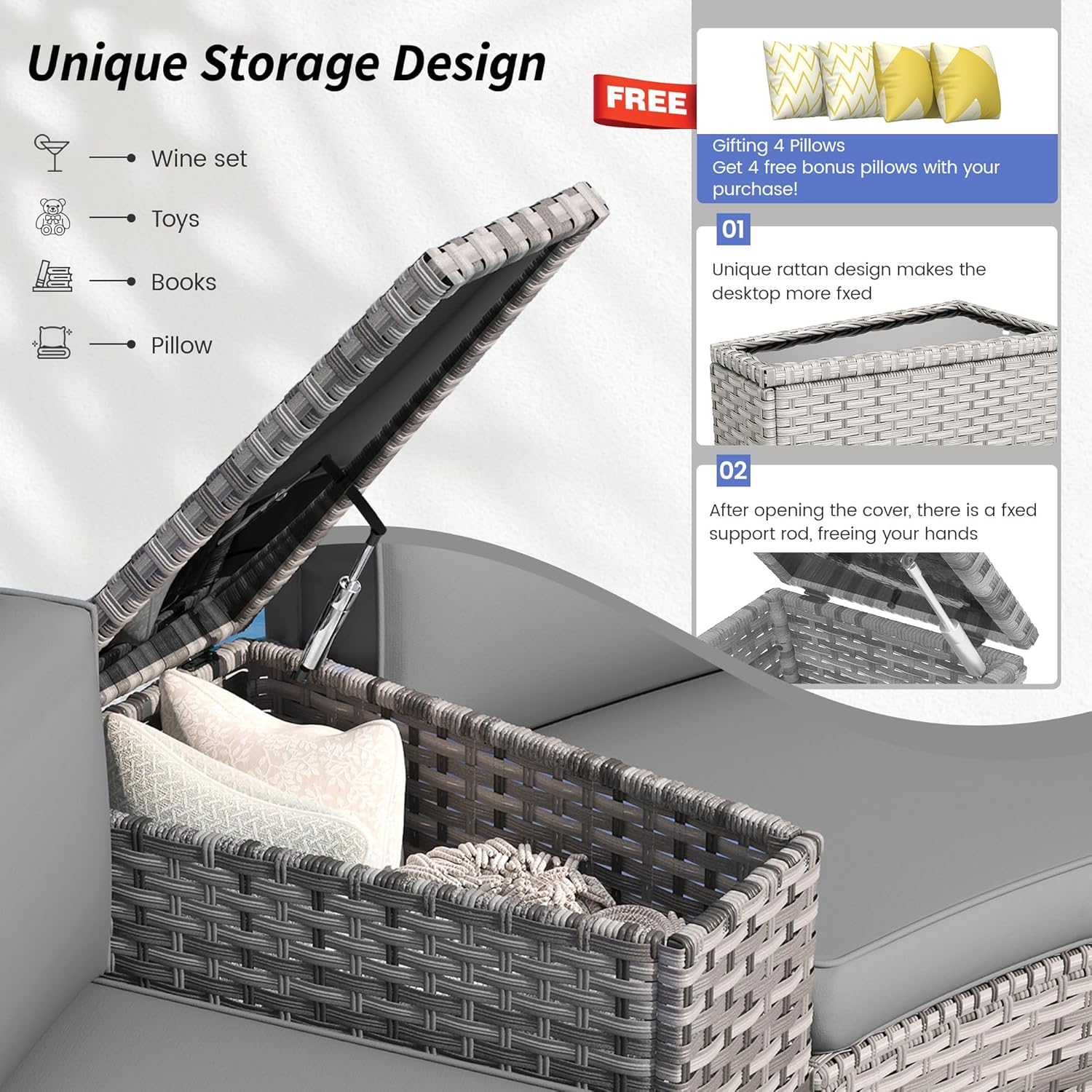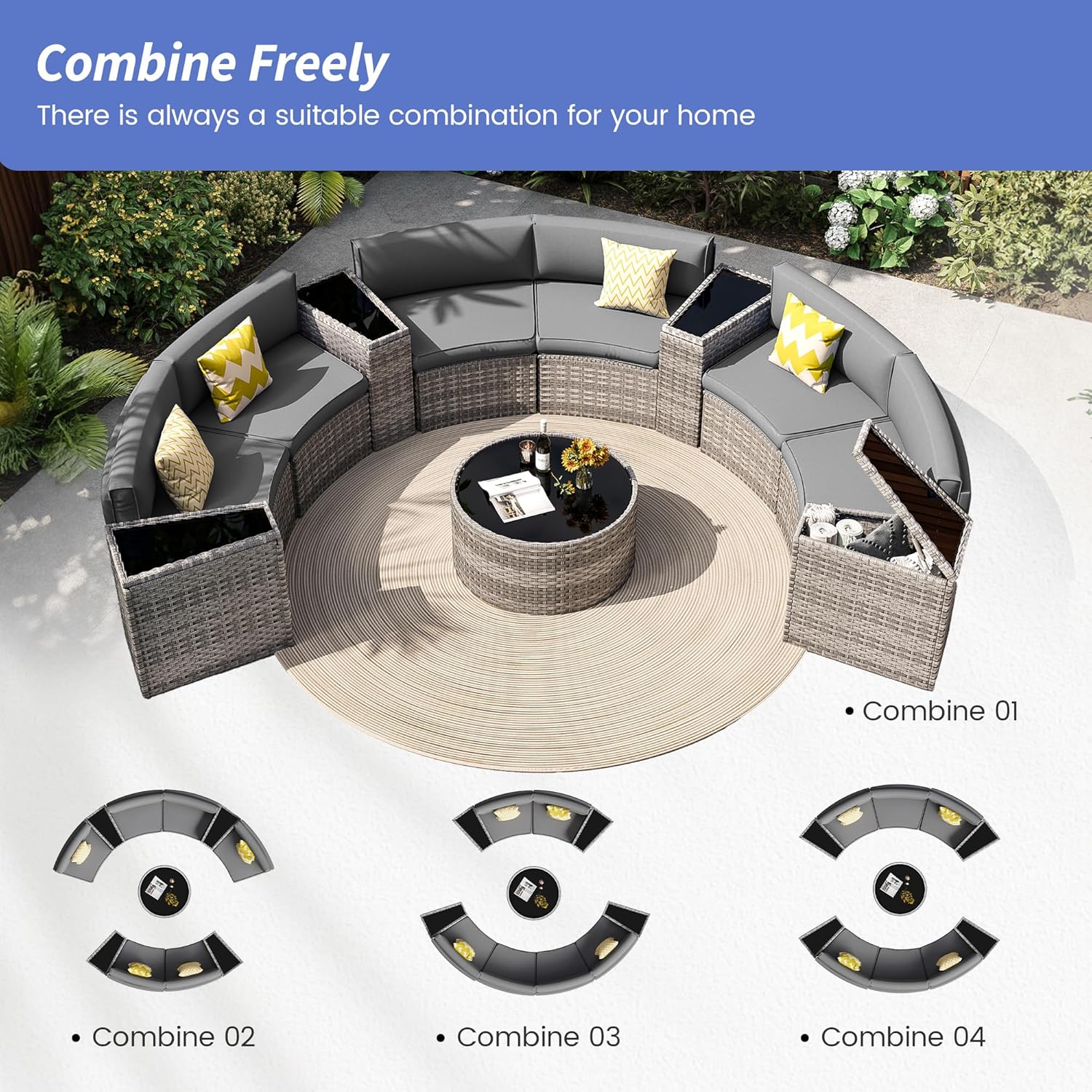 Patio Sectional Furniture Outdoor 11-Piece Grey Rattan Curved Sofa Set with Storage Table,Pillows,Fit for Pool Backyard Balcony Porch Lawn (Grey)