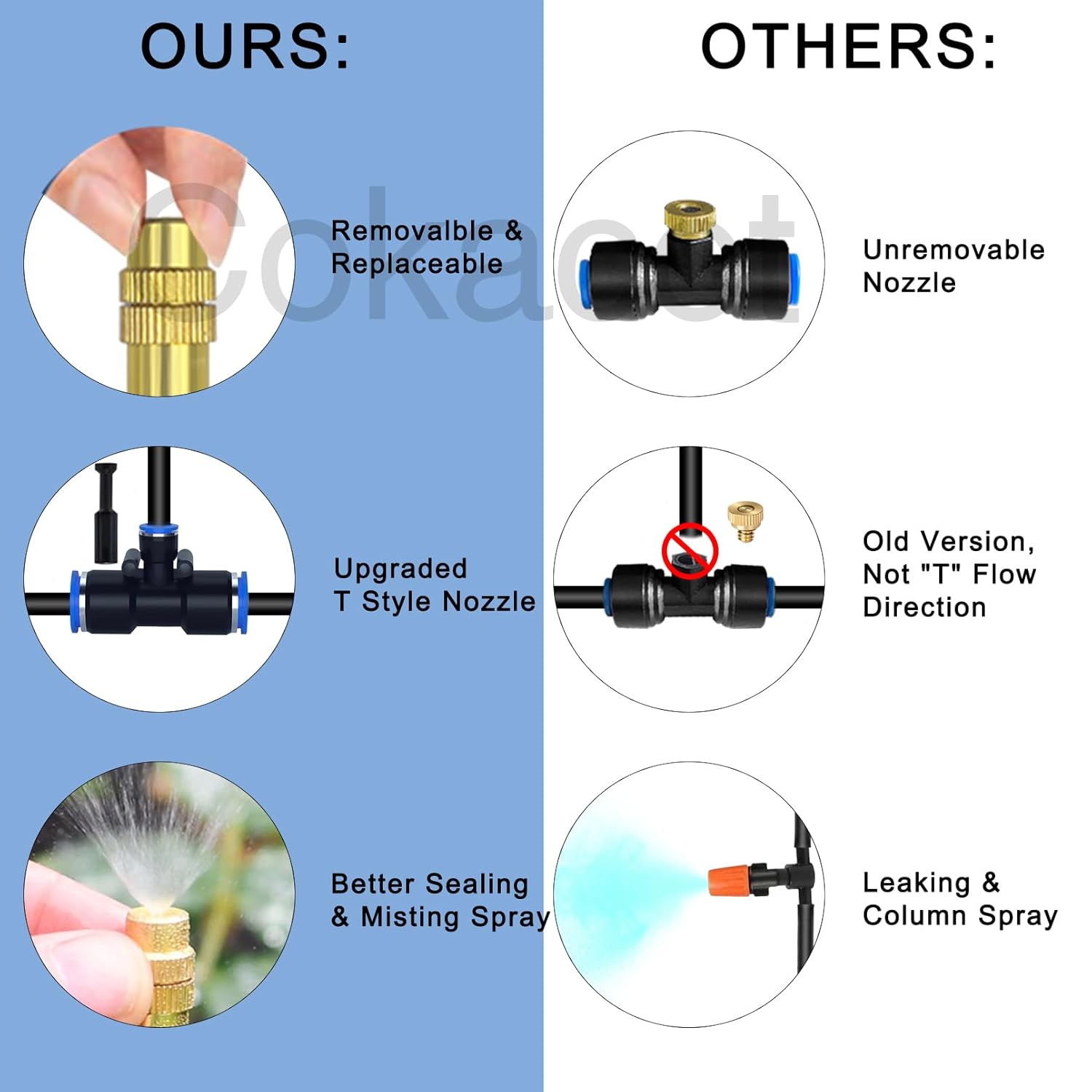 - Upgraded Misting Irrigation System - Cokacot 49.21Ft 8mm drip irrigation tubing system kit with upgraded brass misting nozzles and T-joints has better performance in anti-leaking and connection, the irrigation kit also comes with upgraded 1/2 inch and 3/4 inch faucet adapter with filter net for blocking impurities.