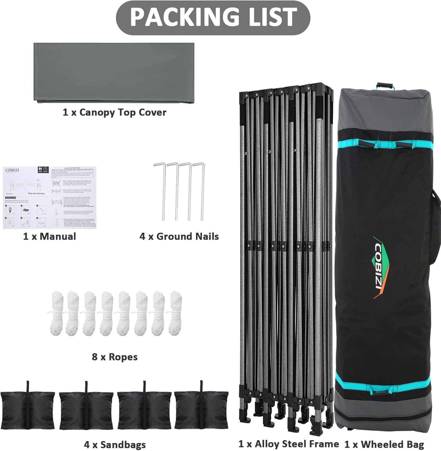 - 【Wheeled Storage Bag】10x30 canopy wheeled roller bag size is 164x66x24cm (64.6x25.9x9.5inch), 600D Oxford Cloth fabric. Storage bag with 3 wheels on the bottom for easy transport. 3 handle on the side for 2 people to lift. 1 handle on the top for 1 people to glide. The Package Includes: Pop up Canopy Frame x 1Pcs + 10′x30′ Canopy Tent Top Cover x 1Pcs + Sandbag x 4Pcs + Ground Nail x 4Pcs + Rope x 8Pcs + Wheeled Storage Bag x 1Pcs.