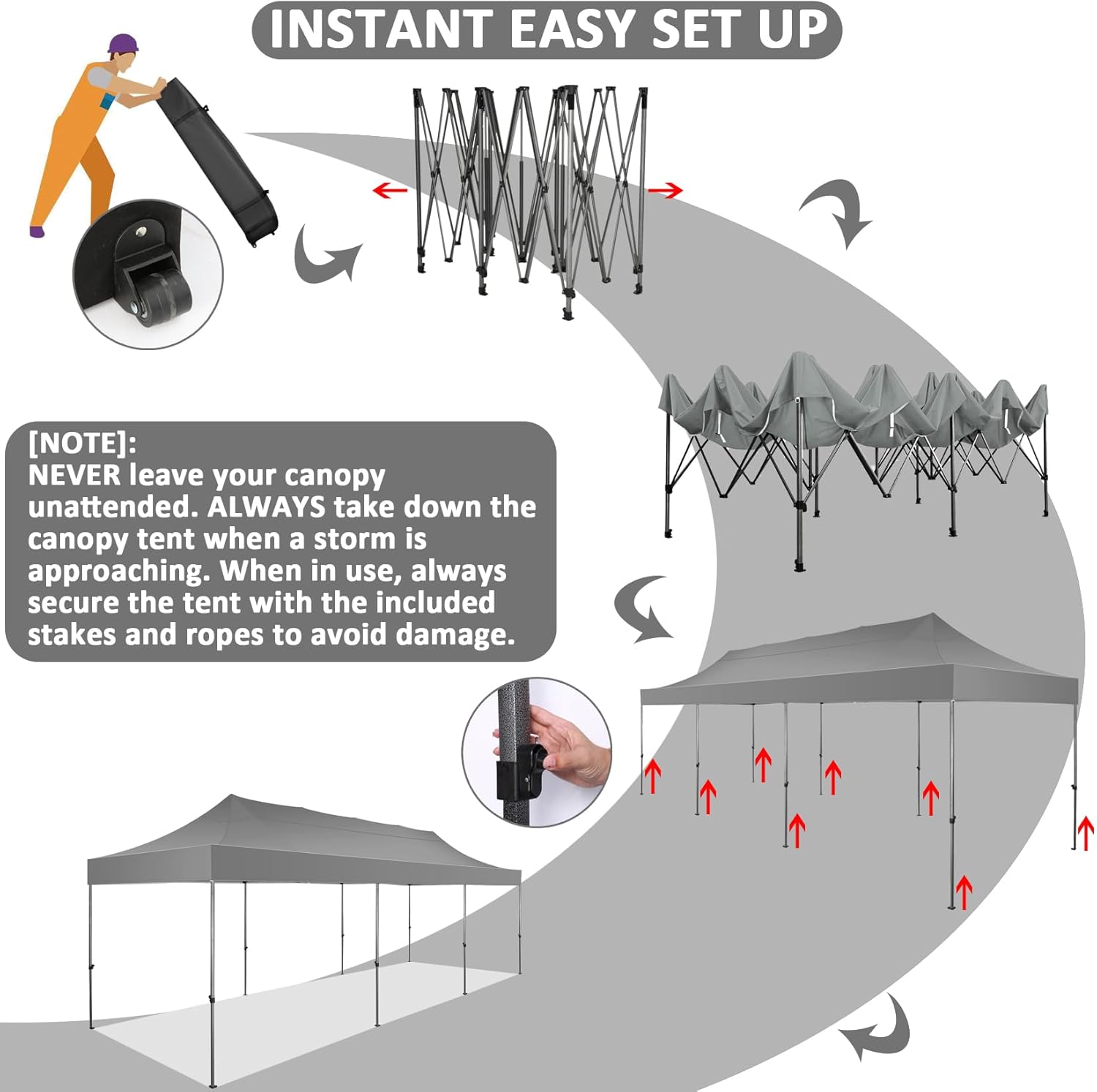 - 【300 SQ Feet Shade Area】COBIZI 10x30 pop up tent provides 300 SQFT spacious covered space, it can easily accommodate 15-20 people, meet your different needs for holding large gatherings. Perfect for wedding, birthday party, market event and other larger events. When in use, always secure the 10x30 pop up tent with the included stakes and ropes to avoid damage. One year after-sale protection for canopy frame; Six months after-sale protection for fabrics and accessories.