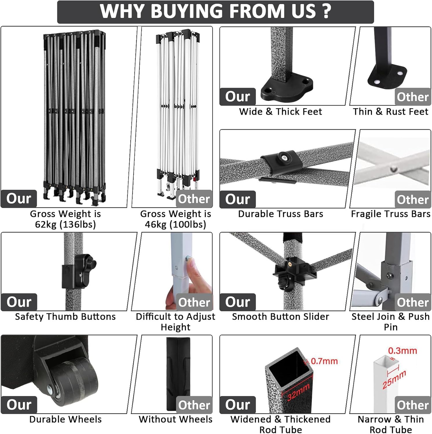 - 【3 Height Settings】10x30 pop up party tent straight leg has 3 height settings. Thumb latch lock system easy to lock and release, raise the pop up tent to a desired height. Canopy tent 10x30 straight leg height options: 220cm/86.6inch, 230cm/90.5inch, 240cm/94.5inch. Corresponding party tent center height options: 305cm/120inch, 315cm/124inch, 325cm/128inch. 10x30 canopy perfect for commercial activities, camping, festivals, tailgating, backyard events and etc..