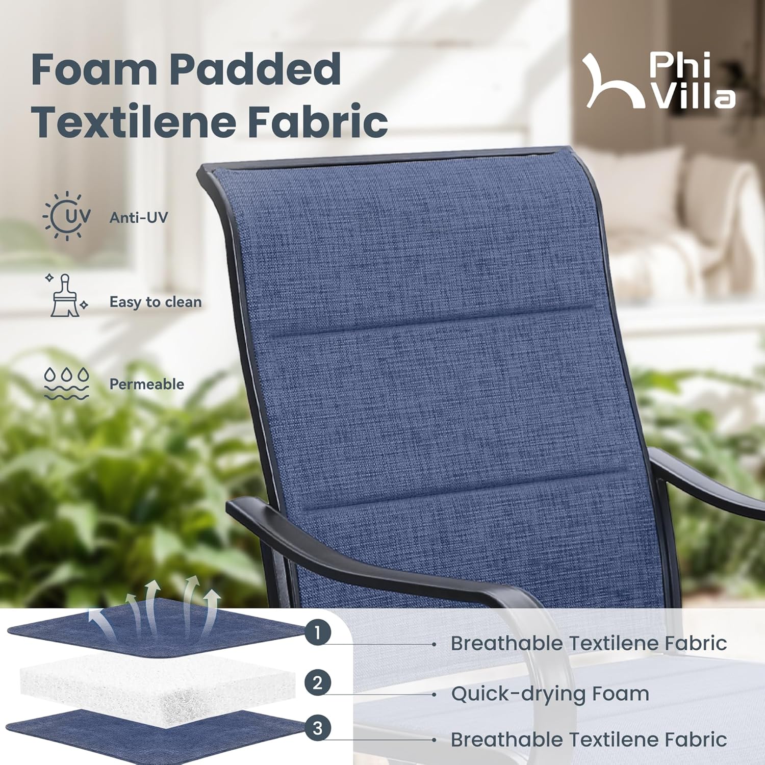 - Padded Back & Seat Design:Breathable Textilene sling fabric padded with fast dry foam on wide seat and high back add extra ease and comfort for your outdoor life