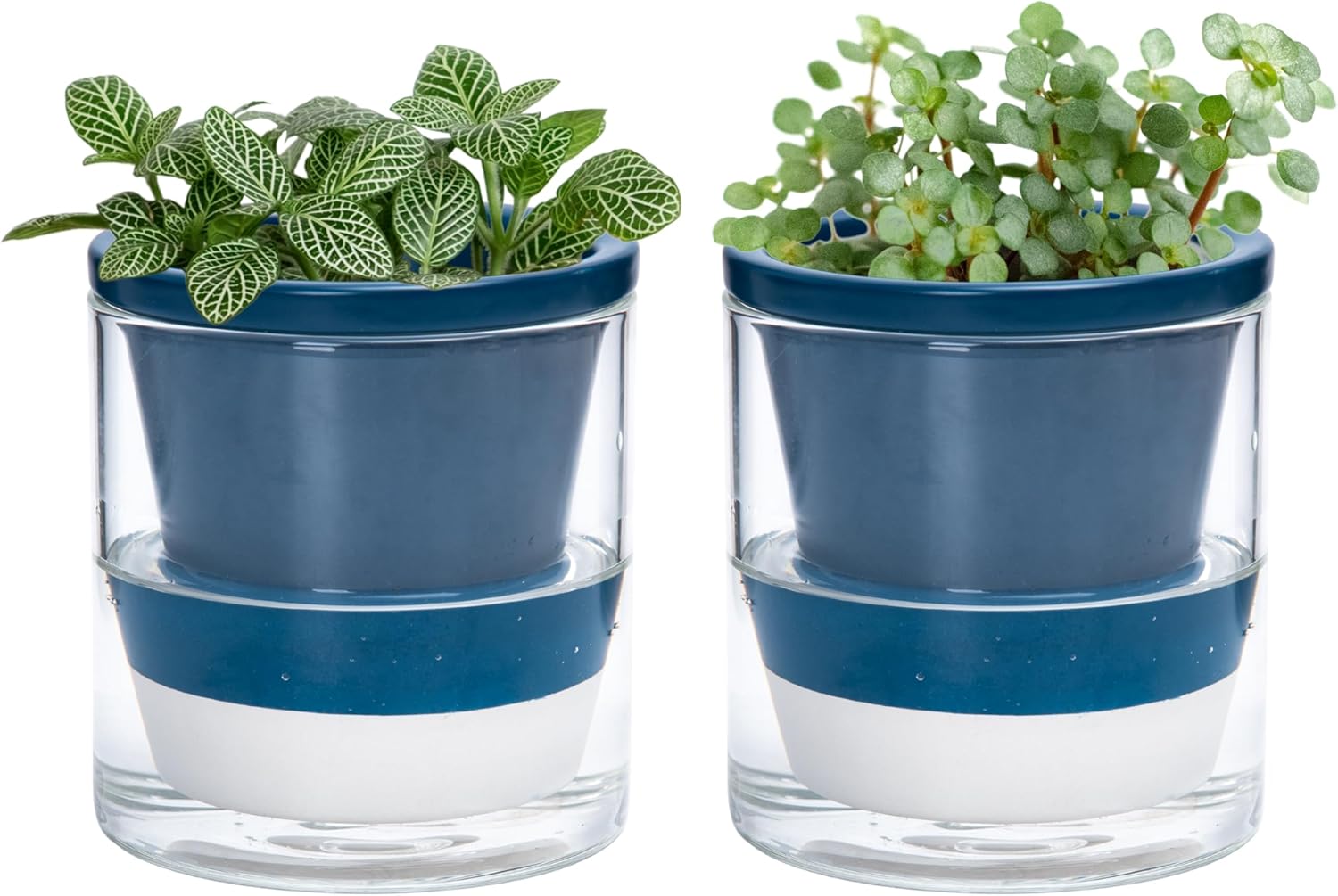 D'vine Dev 4 Inch Design Self Watering Planter for Indoor Plants, Blue Terracotta Pot with Cylinder Glass Cup, Set of 2, 37-Y-A-4
