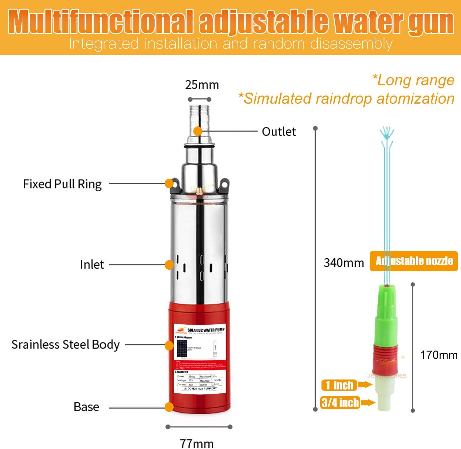 - 1. [Parameters]: JEENSERIES solar water pump 12V DC, 1-inch outlet, 32.8-foot extension cable, maximum head 98 feet, 396GPH flow rate, working current 9A.