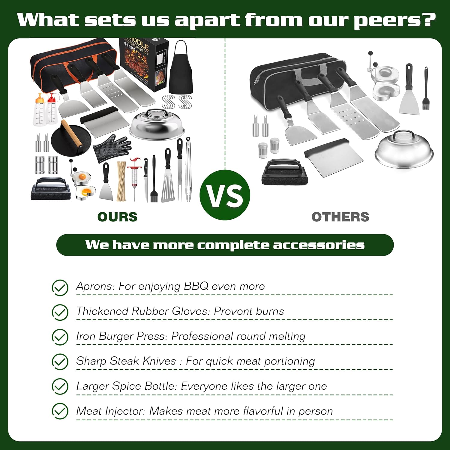 - 【Professional Griddle Tools】:We have a very complete line of BBQ tools, not only the essential grill tools for chefs, but also heat-resistant gloves, aprons, meat injector, a hundred bamboo skewers, etc. It will make everyone happy at your BBQ, weeknight party or everyday meal!