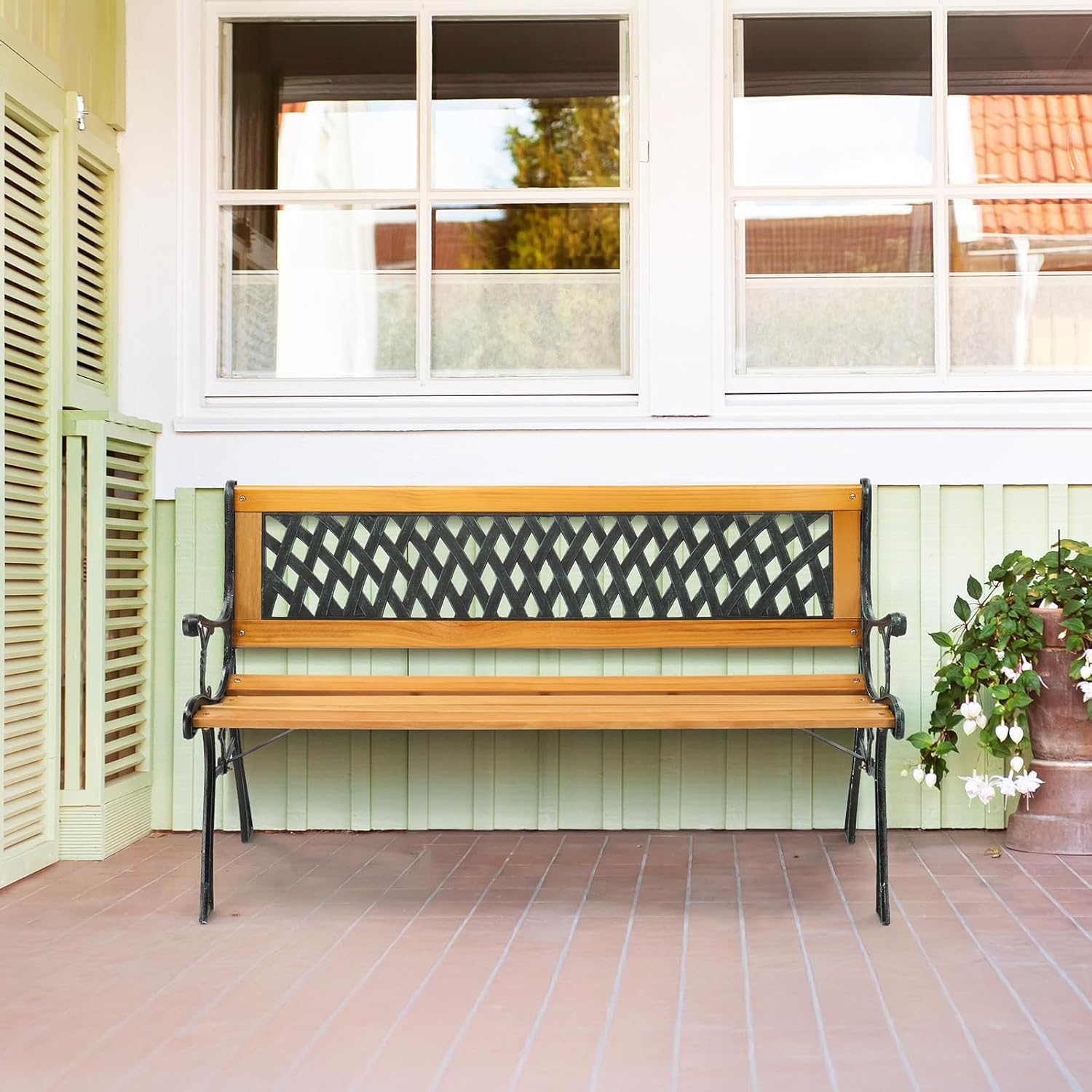 VINGLI Outdoor Bench Metal Garden Bench, Wood Patio Benches w/PVC Backrest Cast Iron Love Seat Park Benches for Porch Yard (Diamond)