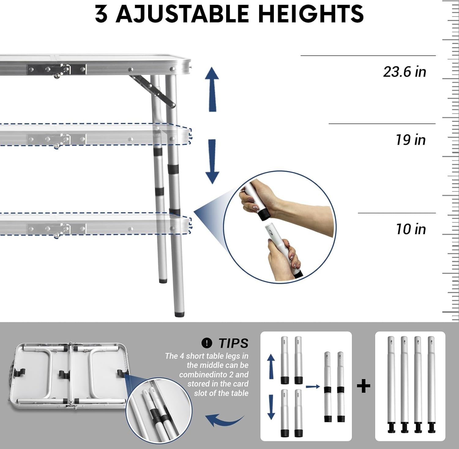- 3 Height Adjustable: The camping table can be adjusted to 3 different heights, suitable for a variety of needs. If the ground underneath the camp table is uneven, simply adjust the table legs to stabilize it