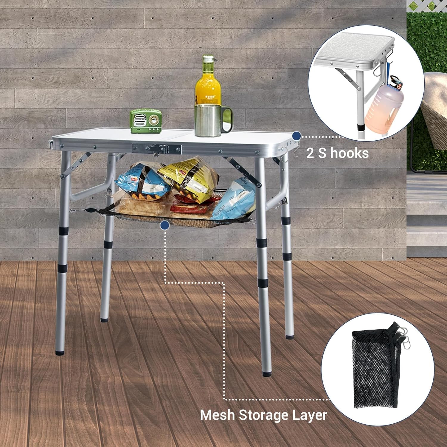 - Extra Storage Space: The portable camping table with mesh storage tier and S hooks provides more space. When camping, you can put some small kitchen tools, snacks, magazines on the mesh tier and use the S hooks to hang speakers, equipment ,etc