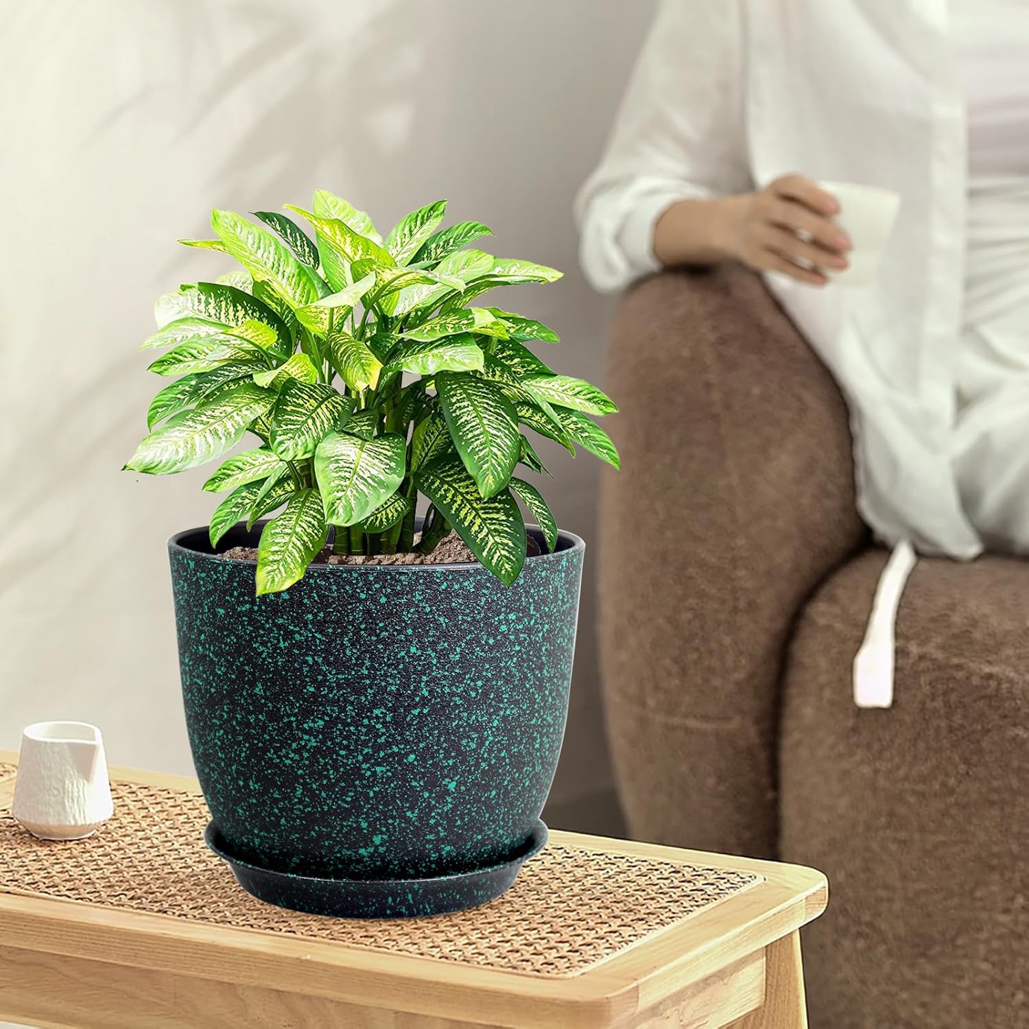 Plant Pots 10/9/8 inch, Set of 3 Modern Decorative Plastic Planters with Drainage Holes and Saucers for Garden House Plants, Flower Pots for Indoor Outdoor Plants, Black with Green Speckles