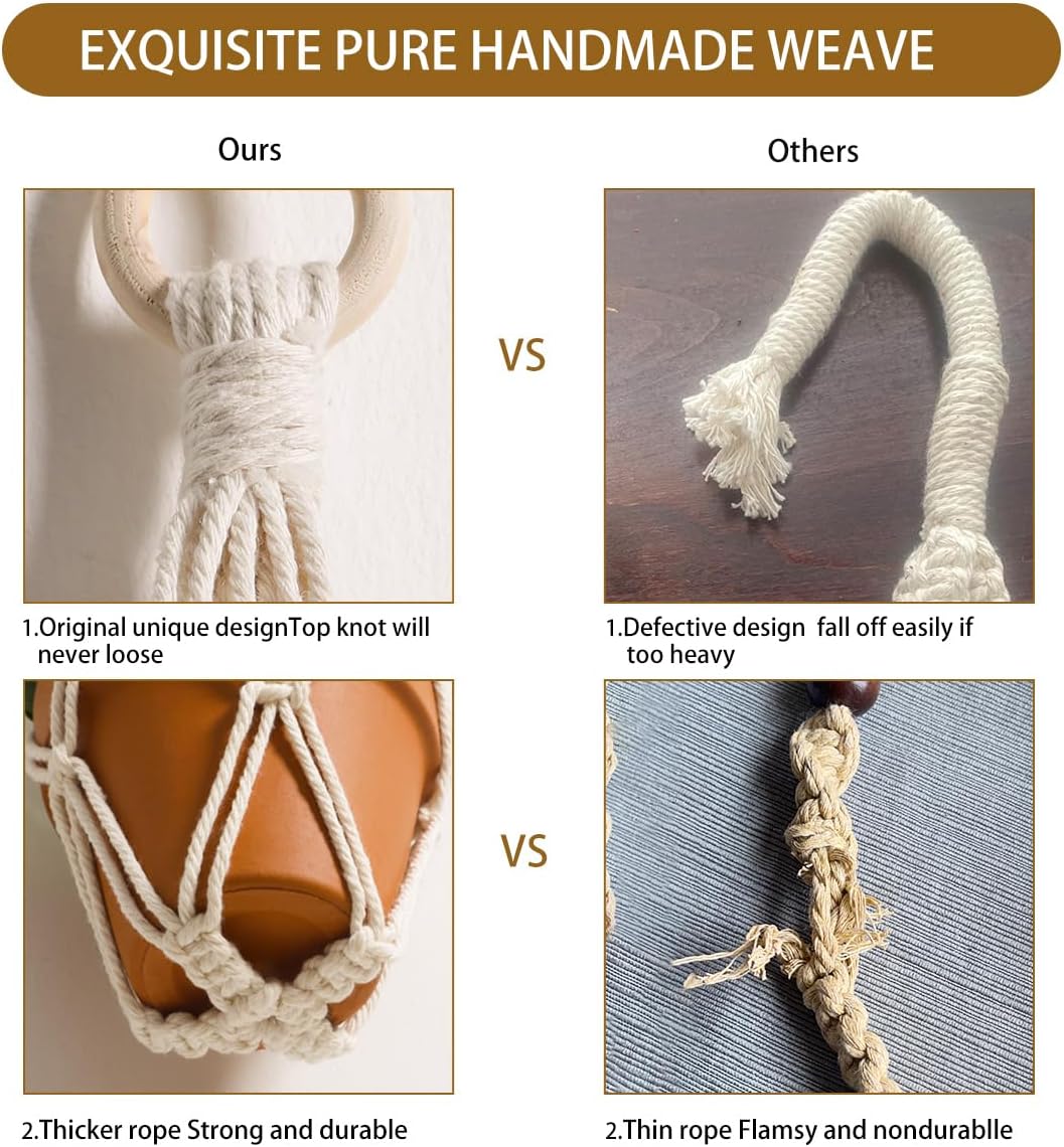 - HANDMADE WEAVING CRAFT - Hanging plant holder made from eco-friendly cotton rope and woodedl ring, It has a strong flexible woven design, sturdy and durable, enough to hold the weight of the pots, not easy to break, you can take them home for your plants with confidence