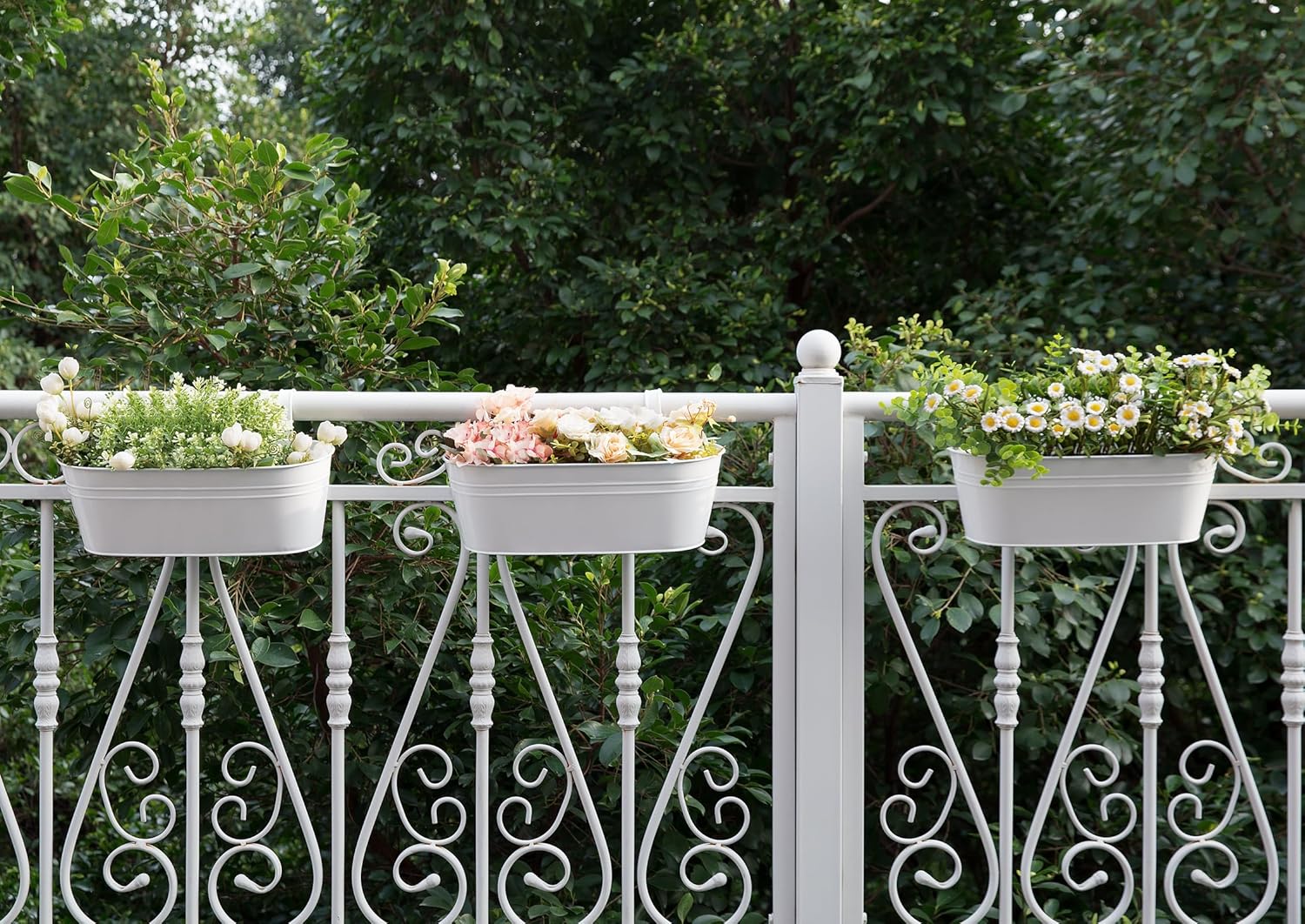 Dahey 3 Pcs Metal Iron Hanging Flower Pots for Railing Fence 15.7 Inch Hanging Bucket Pots Countryside Style Window Flower Plant Holder with Detachable Hooks for Garden Yard Home Decor, White