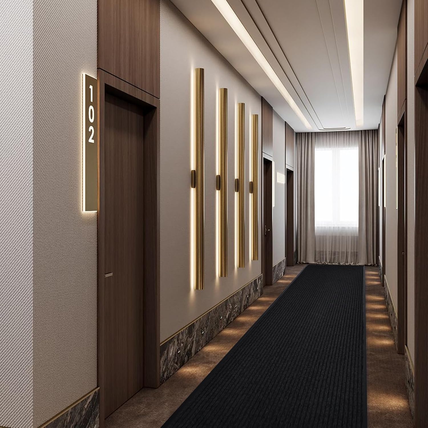 - 【High Quality Stain Resistant Runner Rug】The jet black door mats are made of high quality polyester and rubber. The groove design increase friction, easy to scrape sand off the soles. Effectively absorb oil without splashing. It is a great choice for trapping dirt & moisture from shoes & boots in the toughest applications; Protect your floors from snow, salt, rain and other outdoor debris.